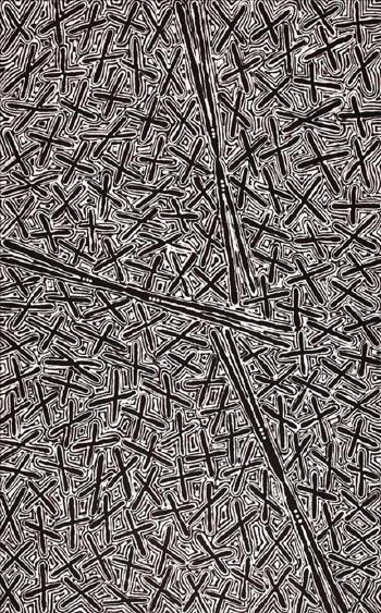 The Jukurrpa site shown in this painting for Ngatijirri (budgerigar [Melopsittacus undulates]) is at Yangarnmpi, south of Yuendumu. 'Ngatijirri' are small, bright green birds native to central Australia which are common around the Yuendumu area, especially after the summer rains. Men would hunt for 'ngatijirri' nests, robbing them of eggs and juvenile birds, which are both considered delicacies. The men would also go out hunting for adult, flying 'ngatijirri', which they would kill by swinging branches, killing sticks or 'karli' (boomerangs) to hit the birds in flight. The 'ngatijirri' travelled to Yangarnmpi from Patirlirri, near Willowra to the east of Yuendumu and travelled further on to Marngangi, north/west of Mount Dennison and west of Yuendumu. Each time the flock of ancestral 'ngatijirri' lands, they perform ceremonies, singing and dancing as they fly and roost in the trees. The sites of these ceremonies are depicted in this painting as concentric circles, while cross-like shapes depict the footprints of the birds on the ground and give an indication of the large flocks of 'ngatijirri' that can be found near