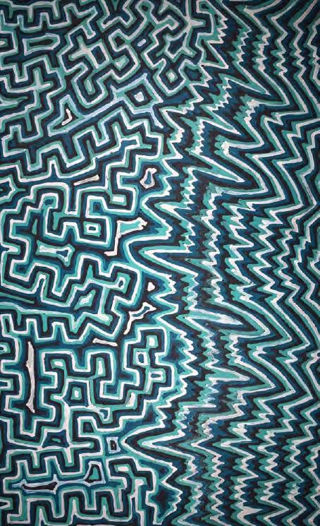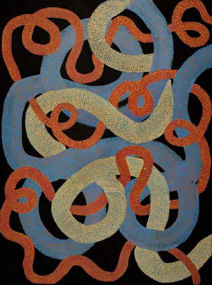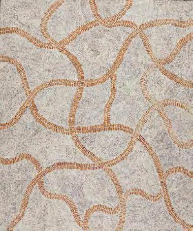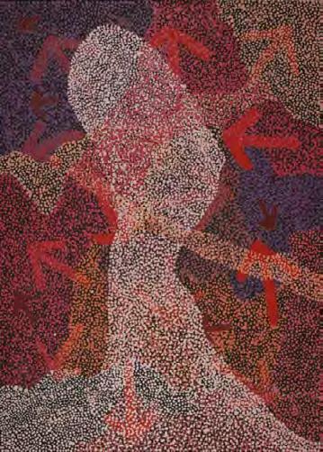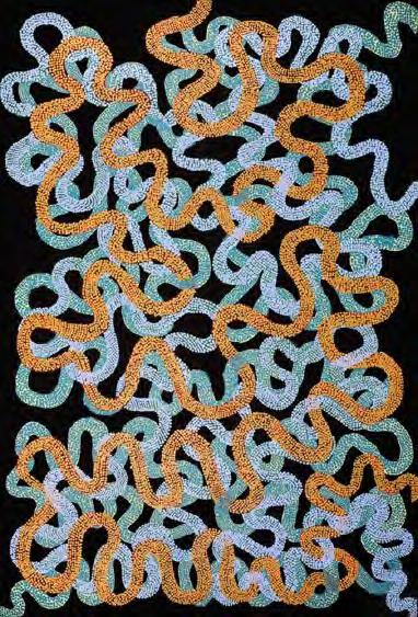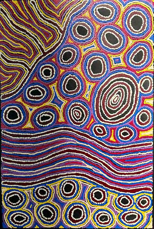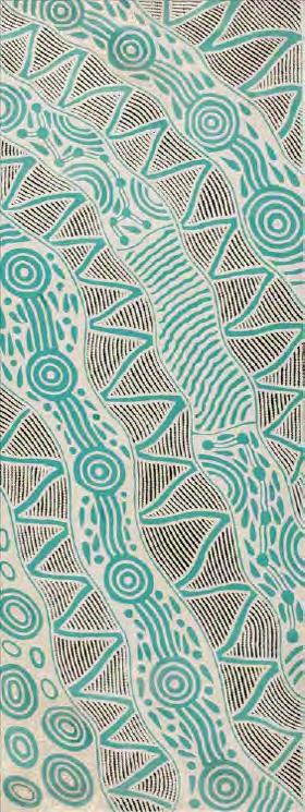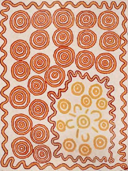 The subject of this work is Lappi Lappi, a rock hole near Lake Hazlett, about 90 km northwest of Lake Mackay in Western Australia. The country belongs to Nampijinpa/Jampijinpa and Nangala/Jangala skin groups. Located in a sheltered basin, the rock hole at Lappi Lappi is a permanent source of water, and is surrounded by country rich in bush tucker. In the time of the Jukurrpa (Dreamtime) many mothers with young children would gather there because it was a safe place to stay. The rock hole at Lappi Lappi is home to a 'warnayarra', a rainbow serpent that travels underground between various rock holes. One day, women were gathered at the rock hole with their children, singing and dancing. When the 'warnayarra1 heard the sound of voices, it travelled silently towards them, under the water. When it reached the edge of the rock hole, it rose out of the water and ate them all.