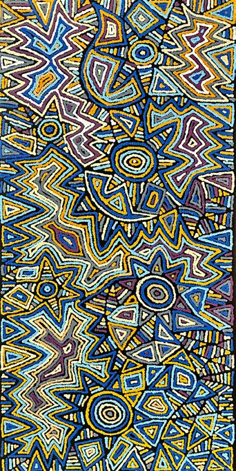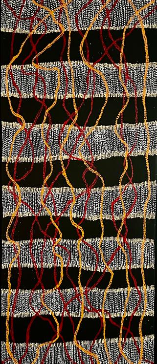 This 'Jukurrpa' (Dreaming) comes from Mina Mina, a very important women's Dreaming site far to the west of Yuendumu near Lake Mackay and the WA border. The 'kirda' (owners) of this Dreaming are Napangardi/Napanangka women and Japangardi/Japanangka men; the area is sacred to Napangardi and Napanangka women. There are a number of 'mulju' (water soakages) and a 'maluri' (clay pan) at Mina Mina.