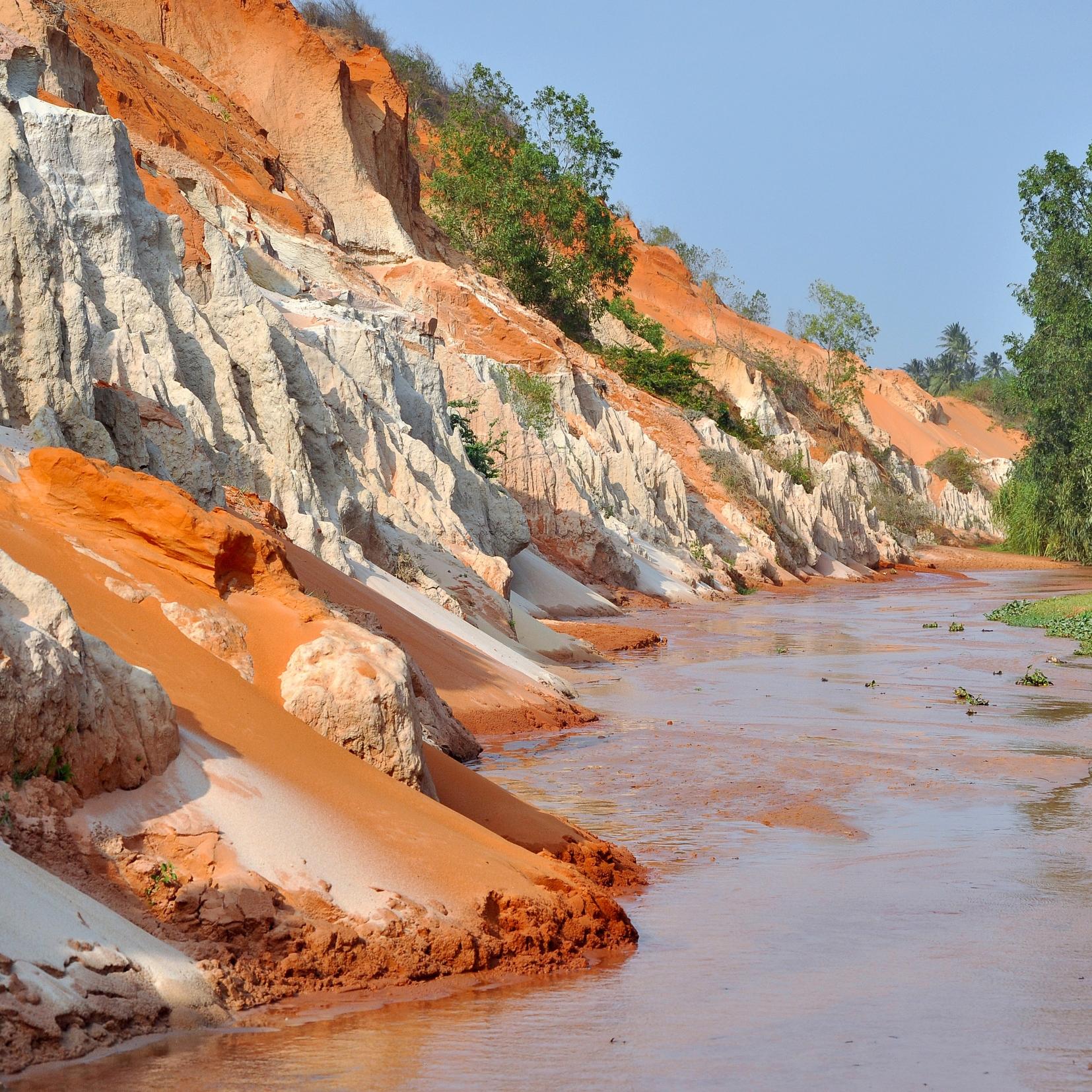 Wade barefoot in the small stream that stays at a relatively shallow depth. Pass unique cafés and wildlife sightings before reaching a mini waterfall. Edging along one side of the stream, dramatic geological formations with striking red, white, pink, orange and green hues capture your attention with lush vegetation of diverse trees and flowers carpetingtheoppositeside.