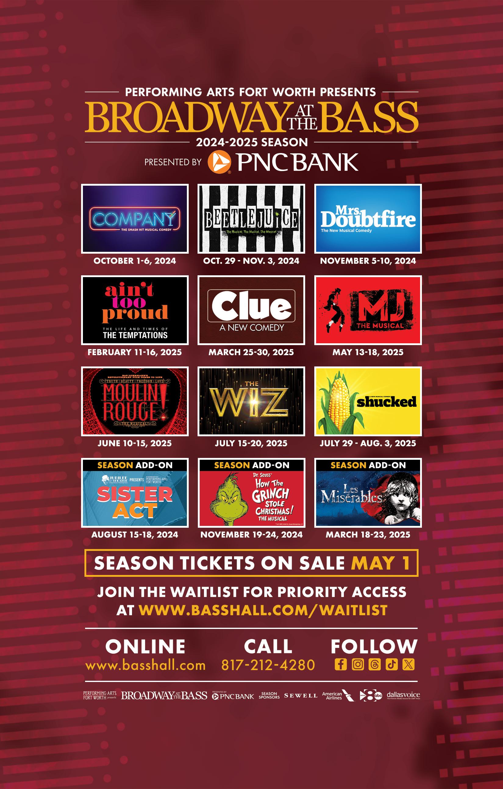 The 2024-2025 Broadway Season presented by PNC Bank features fresh revivals, original tales and spectacular showstoppers! New season tickets will go on sale the week of April 29. Join the waitlist at www.basshall.com/waitlist to get priority access.