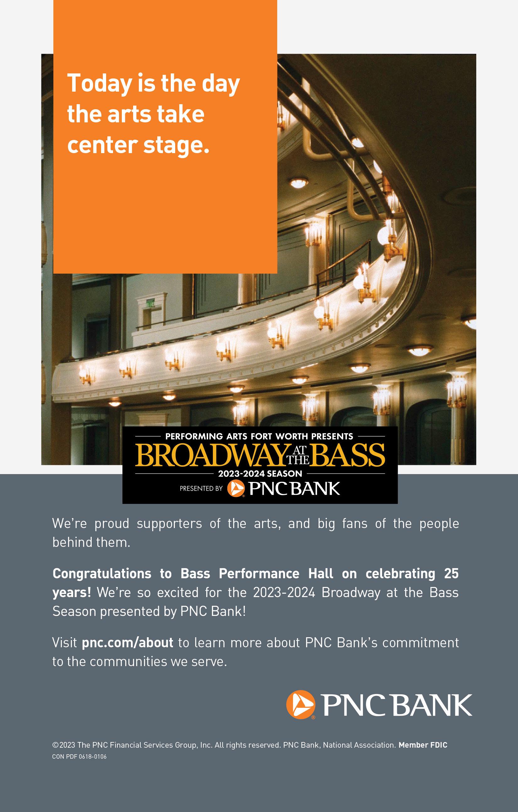 Next up, the 2023-2024 Broadway at the Bass Season presented by PNC Bank concludes with the 25th anniversary tour of Mamma Mia! , July 16-21. Then, Jubilee Theatre returns to the Bass Hall stage with their production of Sister Act , August 15-18, as a Season Add-On to the 2024-2025 Broadway at the Bass Season presented by PNC Bank . This season features fresh revivals, original tales and spectacular showstoppers! I invite you to explore this exciting lineup and to learn more about Season Tickets by visiting www.basshall.com/batb2425.