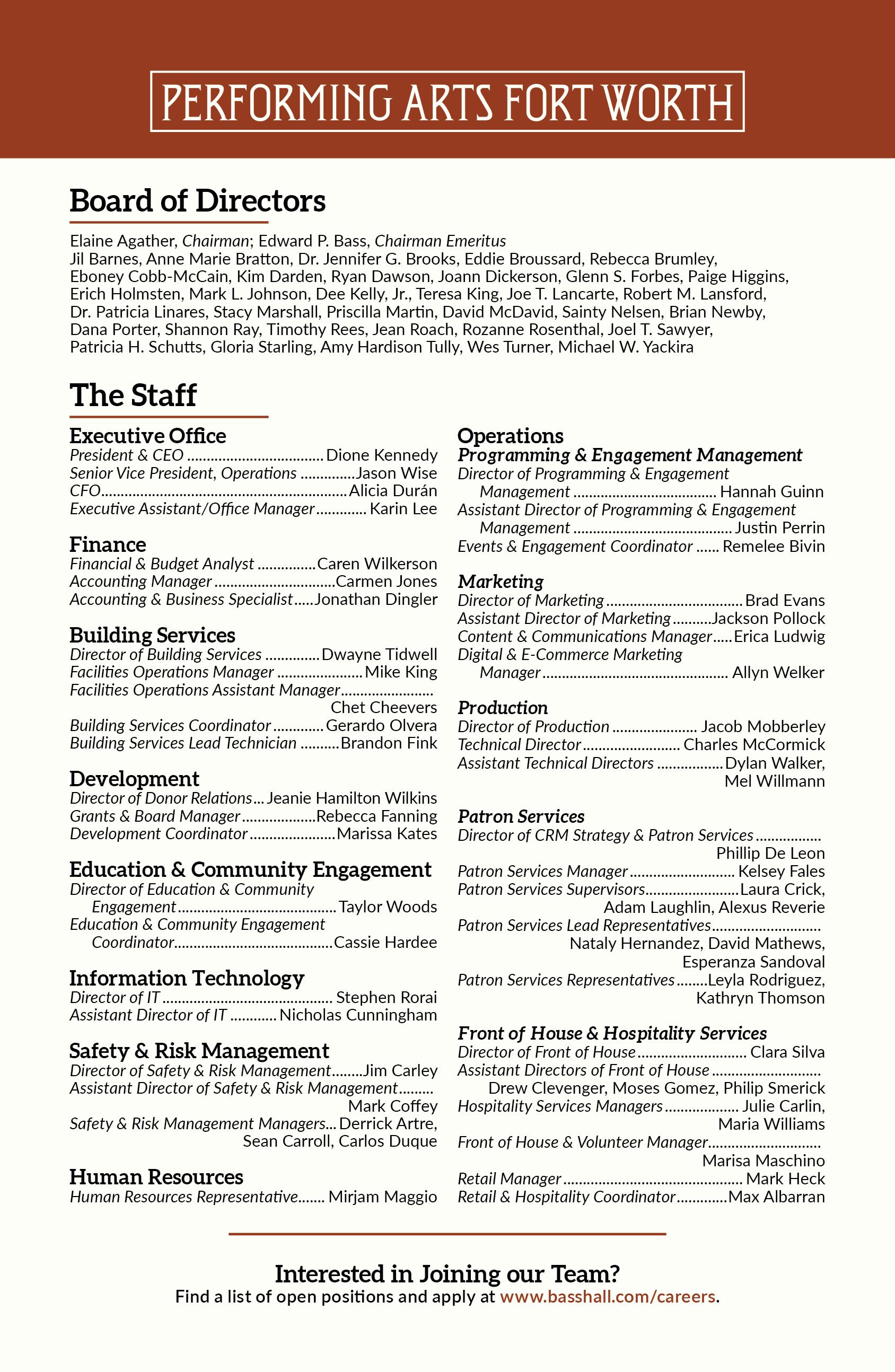 elcome to Bass Performance Hall. On behalf of the Performing Arts Fort Worth staff and Board of Directors, I thank you for joining us.