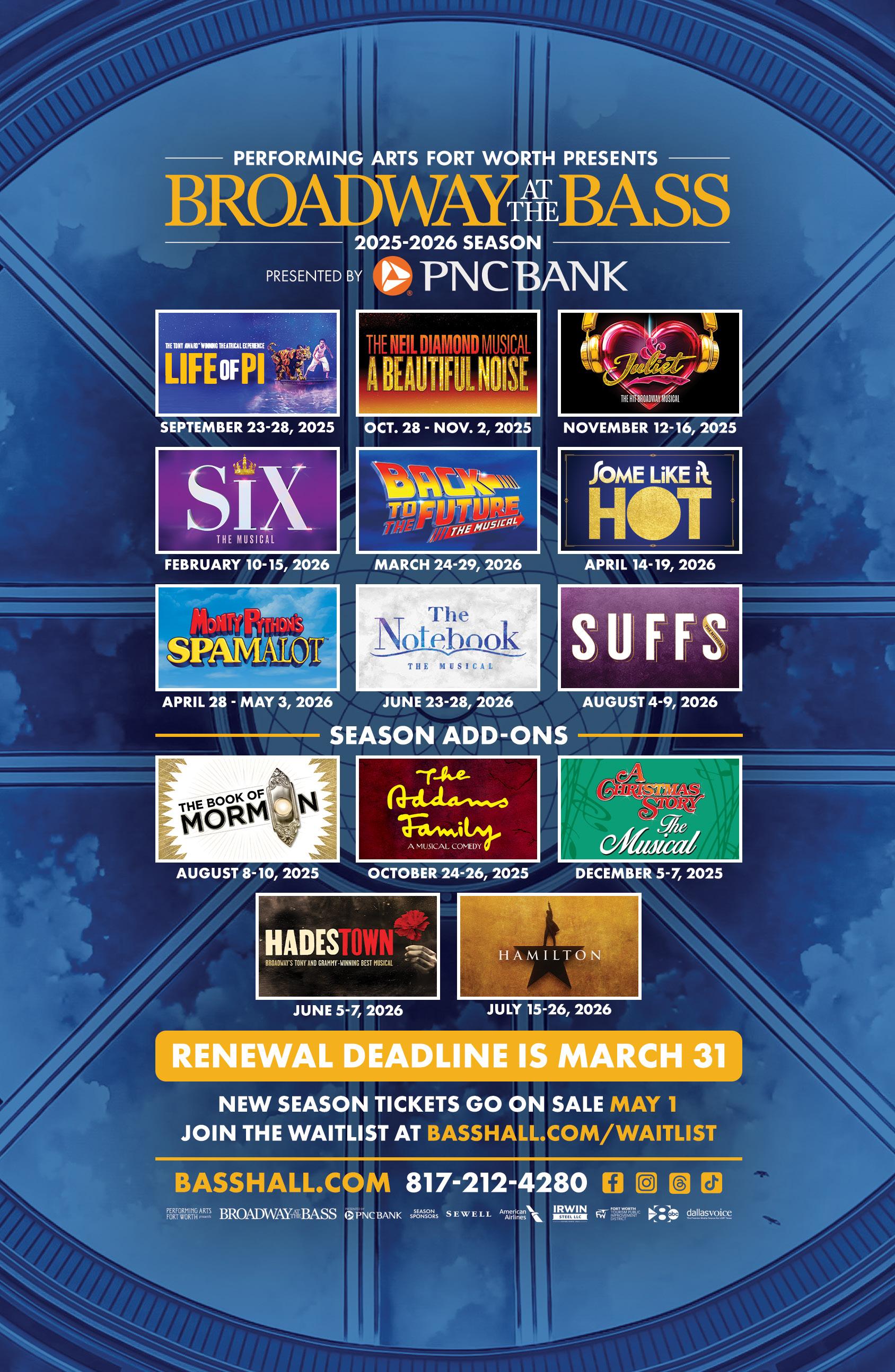 Next up, the 2024-2025 Broadway at the Bass Series presented by PNC Bank continues with back-to-back runs of the world’s most popular musical, Les Misérables, March 18-23, followed by the uproarious new play based on the classic board game, Clue, March 25-30. Did you catch our announcement of the 2025-2026 Broadway Season last month? Visit www.basshall.com to learn more and find tickets for your next stop at Fort Worth’s home for the performing arts.