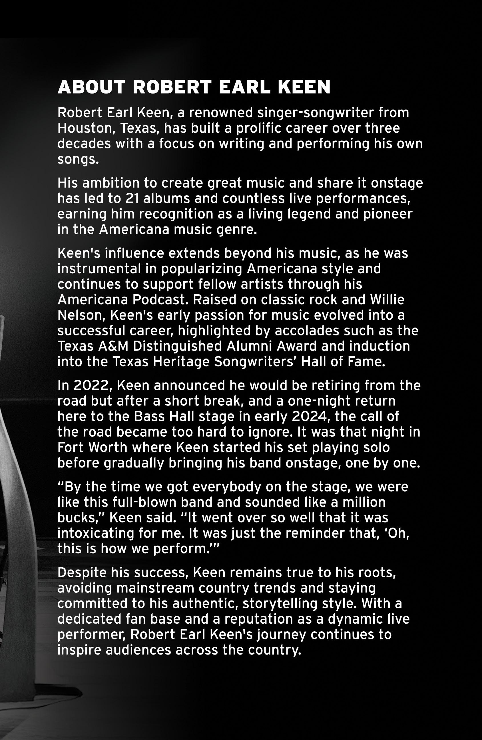 From fashion to music, interior design to television, not to mention the increase of foot traffic we see finding its way to our great city, the Americana style is having its moment. But for Robert Earl Keen, Americana isn’t a trend. It’s a way of life. Tonight, we welcome back one of the Lone Star State’s finest singer-songwriters to the Bass Hall stage. Sharp-minded fans will remember REK’s short reprieve from the highways and byways when he retired from the road in 2022. It was on our very stage in January 2024, for what was supposed to be a one-off concert, that he heard the call of the road once again as Keen recently mentioned to Rolling Stone. While the Houston native is no stranger to Fort Worth, it is an honor to play a small part in his journey.