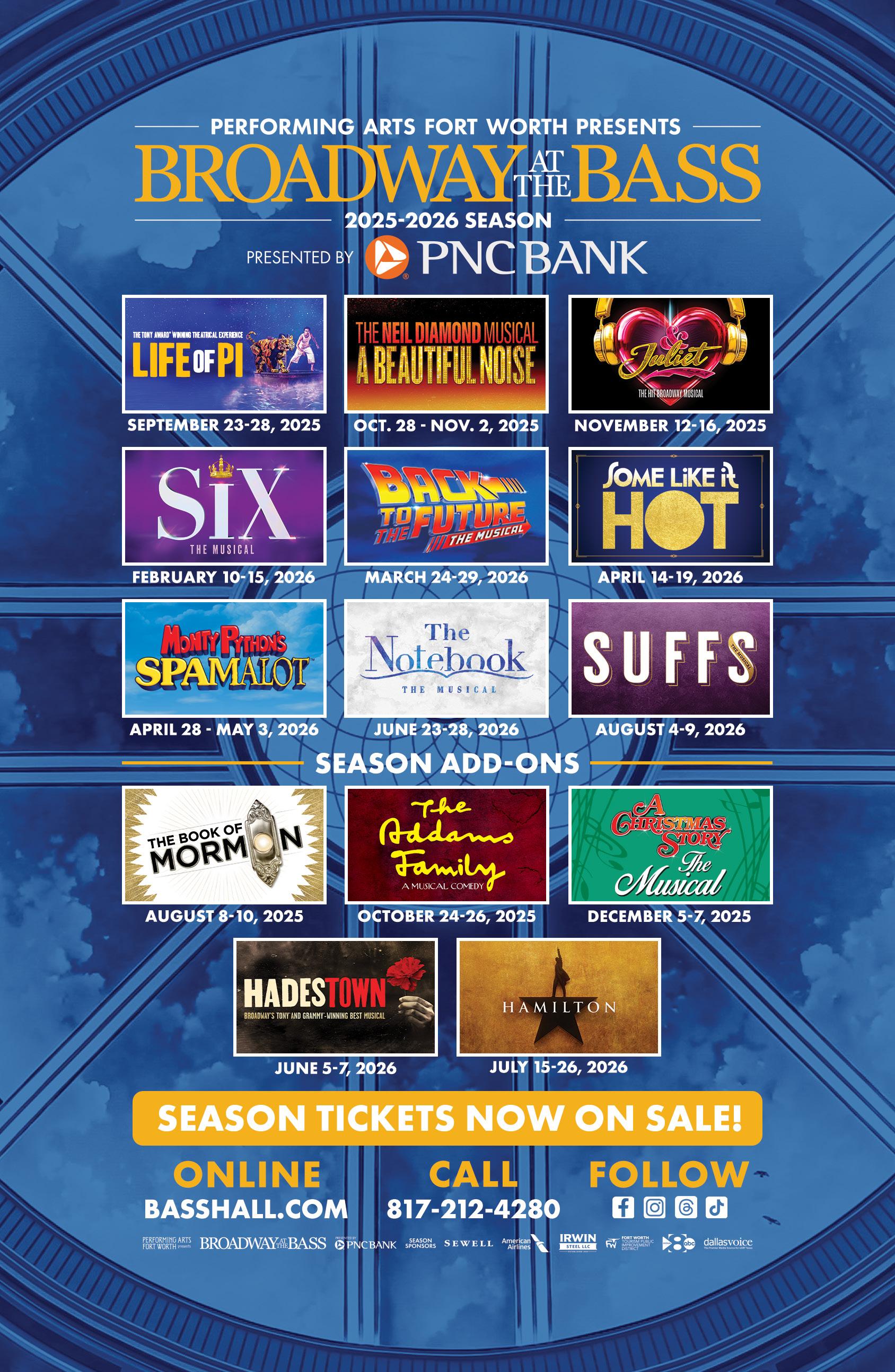 Next weekend, back by popular demand, The Book of Mormon returns as a Season Add-On, kicking off the 2025-2026 Broadway at the Bass Season presented by PNC Bank. Then, the visually stunning play based on the best-selling novel Life of Pi comes this September. Visit www.basshall.com to learn more about all the spectacular shows coming up in the 2025-2026 Season, and of course, to secure your seats for your next visit with us.