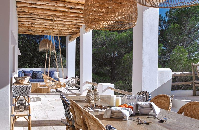 The patio serves as an outdoor lounge next to the garden with wicker chairs of different designs and ceilings with juniper wood beams. This environment creates the feeling of being outside but with the comfort of being inside. It is a perfect space to relax and meditate in the presence of the idyllic energy coming from the great Es Vedrá and its companion for life, the smaller rock, Es Vedranell.
