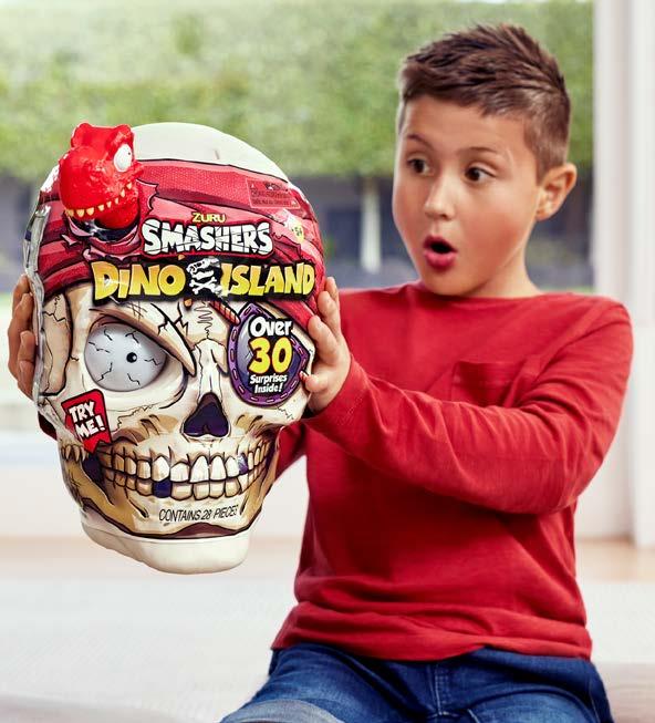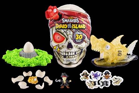 Uncover the 30 hidden surprises inside this action-packed skull! Search through cotton candy foam and super stretchy slime for your dino pieces! Along the way, look out for a pesky pirate figurine and 5 epic smashers mini eggs that hold exclusive characters!