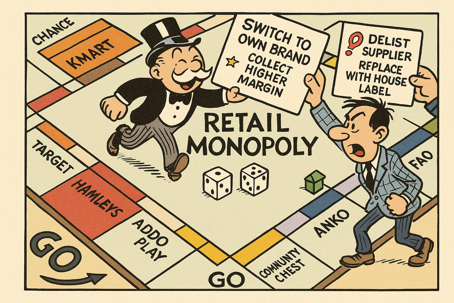 Walk into any Kmart in Australia and take a proper look. Roughly 85% of the toys on their shelves are under their own Anko label. Not hidden in the back—front and centre. Target's not far behind, now pushing around 50% private label and increasingly sourcing from the same pool as Kmart. Different logo, same supply chain. No surprise really—they both belong to Wesfarmers.
