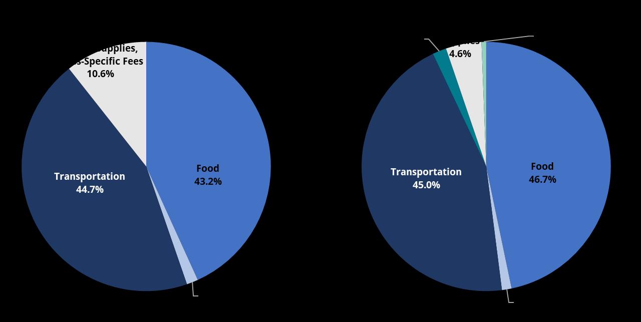 Figure 12 illustrates the distribution of grants across the categories, comparing year two (2022-23) to year three (2023-24). In both years, Transportation and Food remain the most frequently requested categories. Due to discrepancies in reporting, Books, Supplies, and Class-Specific fees were combined for year two reporting. When separated in year three, these categories show distinct distributions, with Supplies being the most frequently granted category, and Class-Specific Fees the least. While Books, Supplies, and ClassSpecific Fees made up only 7% of grants in 2023-24, this category represented 17% of spending.