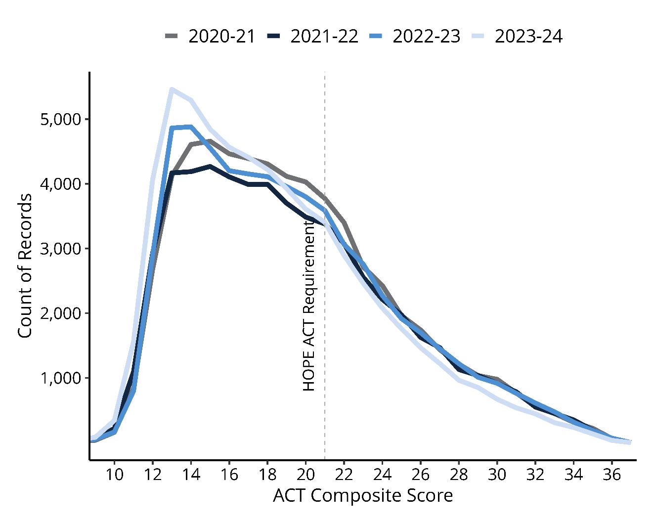 Notes: Community service requirements were waived for the 2020-21 cohort due to the COVID-19 pandemic. Cohort years refer to the first year a student is enrolled in postsecondary education. Summer 2024 enrollment data is not available at this time for the 2023-24 cohort