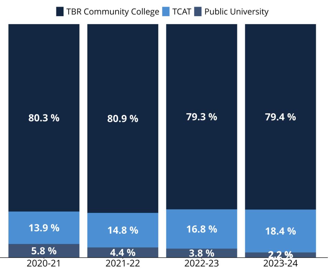 • TCAT Enrollment: Over 18% of Tennessee Promise students in the 2023-24 cohort chose to enroll at TCATs during their first semester in postsecondary education, representing a historical high and a 1.6 percentage point increase from the 2022-23 cohort.