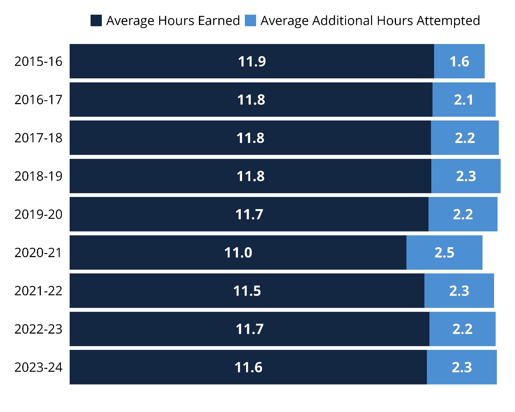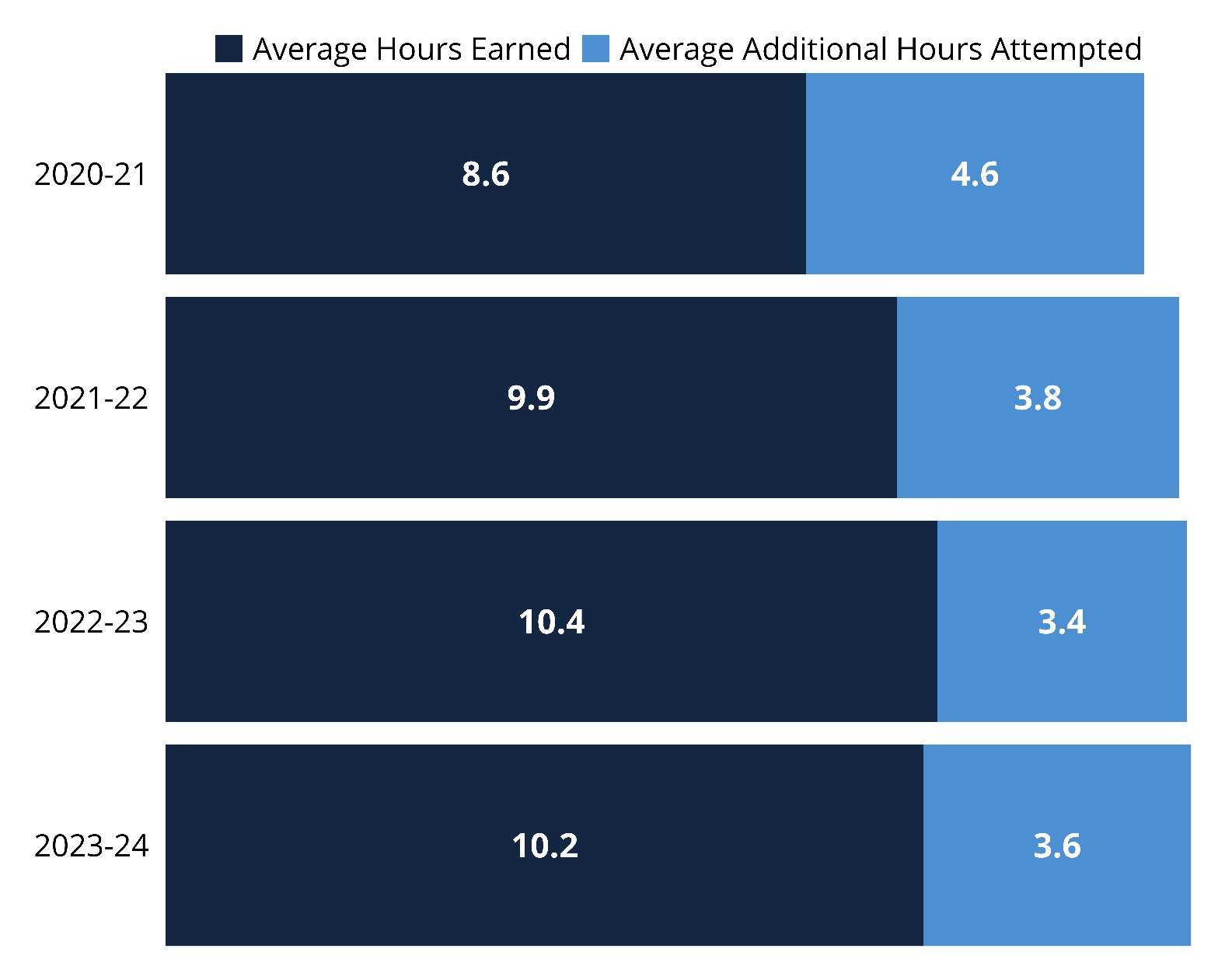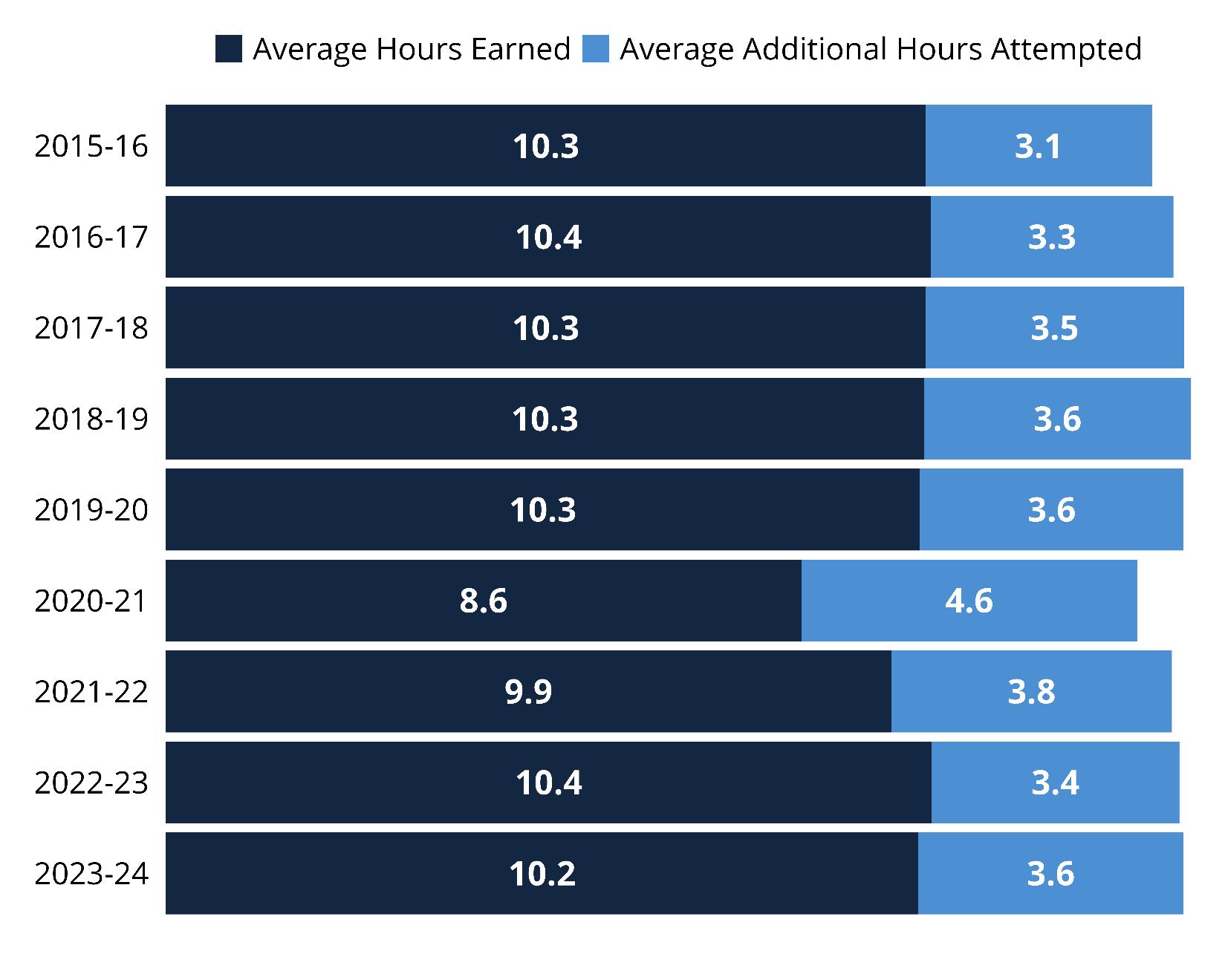 • Tennessee Promise students in the 2023-24 cohort attempted 13.8 credit hours on average in their first semester, and they earned 10.2 of those credit hours, on average (Figure 6 and Figure 7). Some students, for various reasons, earn zero credits in their first semester. This represents 1,363 (or 12.0% of) students in the 2023-24 cohort who are enrolled at eligible public, non-TCAT institutions.
