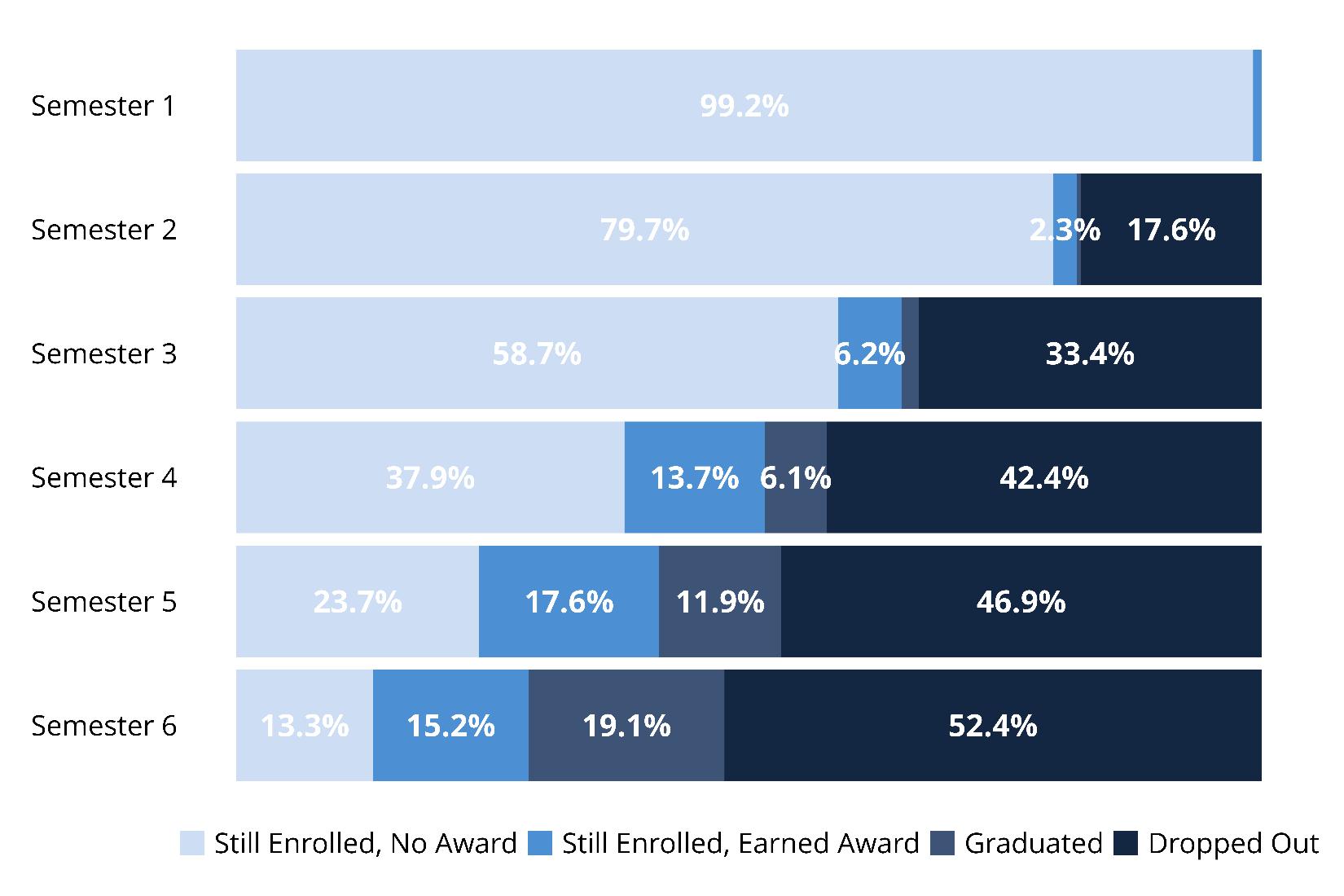 Notes: Semester 1 shows fall 2019 results, semester 2 shows spring 2020, semester 3 shows fall 2020 and so on. Data are limited to students who enrolled in the fall of their cohort year. Awards are noted as of the end of that semester.