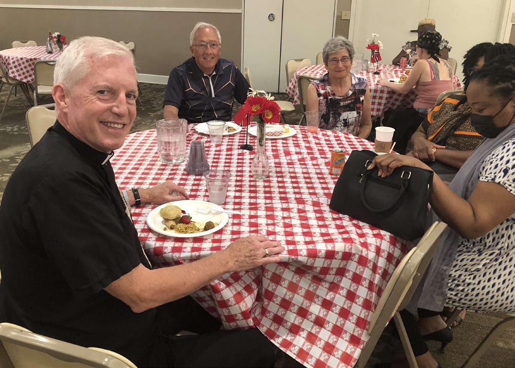 MADELYN REICHERT | THE CATHOLIC SPIRIT Bishop-elect Kenney pauses for a photo July 28 at the St. Olaf Day potluck at St. Olaf in downtown Minneapolis. Also
