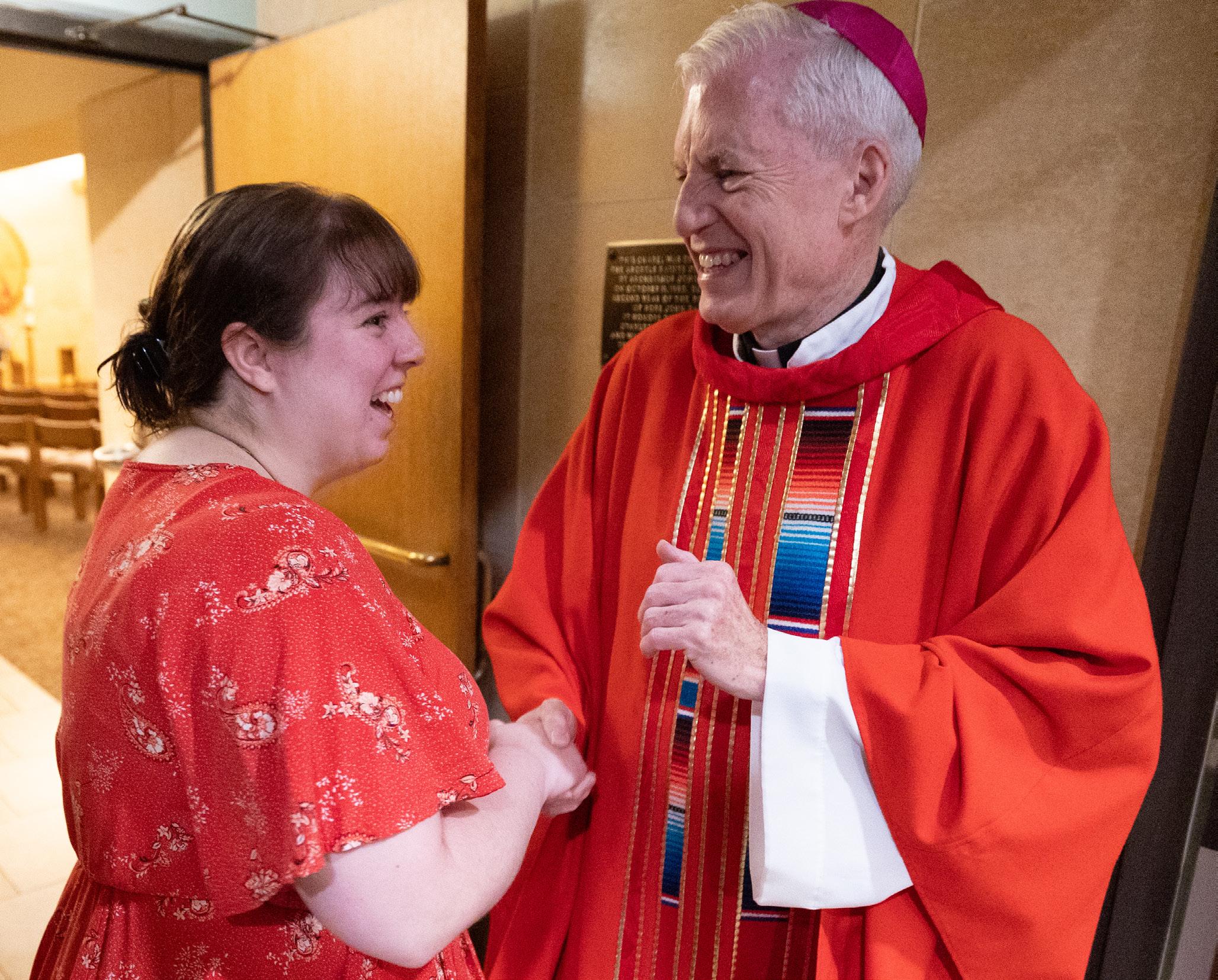 Bishop-elect Kevin Kenney greets Vern Reske, hospitality coordinator at St. Olaf in Minneapolis, after the morning Mass July 25, when his appointment as an auxiliary bishop for the Archdiocese of St. Paul and Minneapolis was announced by Archbishop Bernard Hebda.
