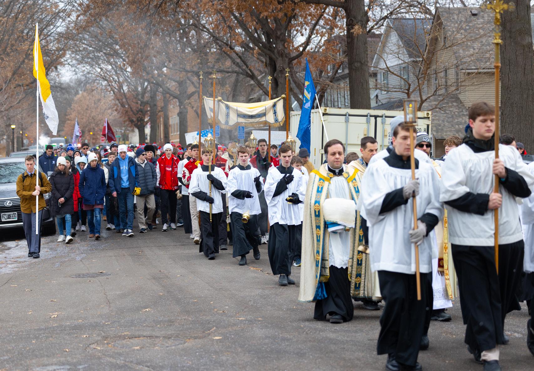 PROCESSION FOR LIFE About 700 students from Catholic schools in the Archdiocese of St. Paul and Minneapolis marched in a Eucharistic procession from St. Agnes School in St. Paul to the Minnesota State Capitol on Jan. 22. It was part of a day-long series of pro-life activities called the Students for Life March and Rally, sponsored by the archdiocese and Students for Life of America. Father John Ubel, pastor of St. Agnes, was the first to process with the Eucharist. Several other priests took turns along the way.