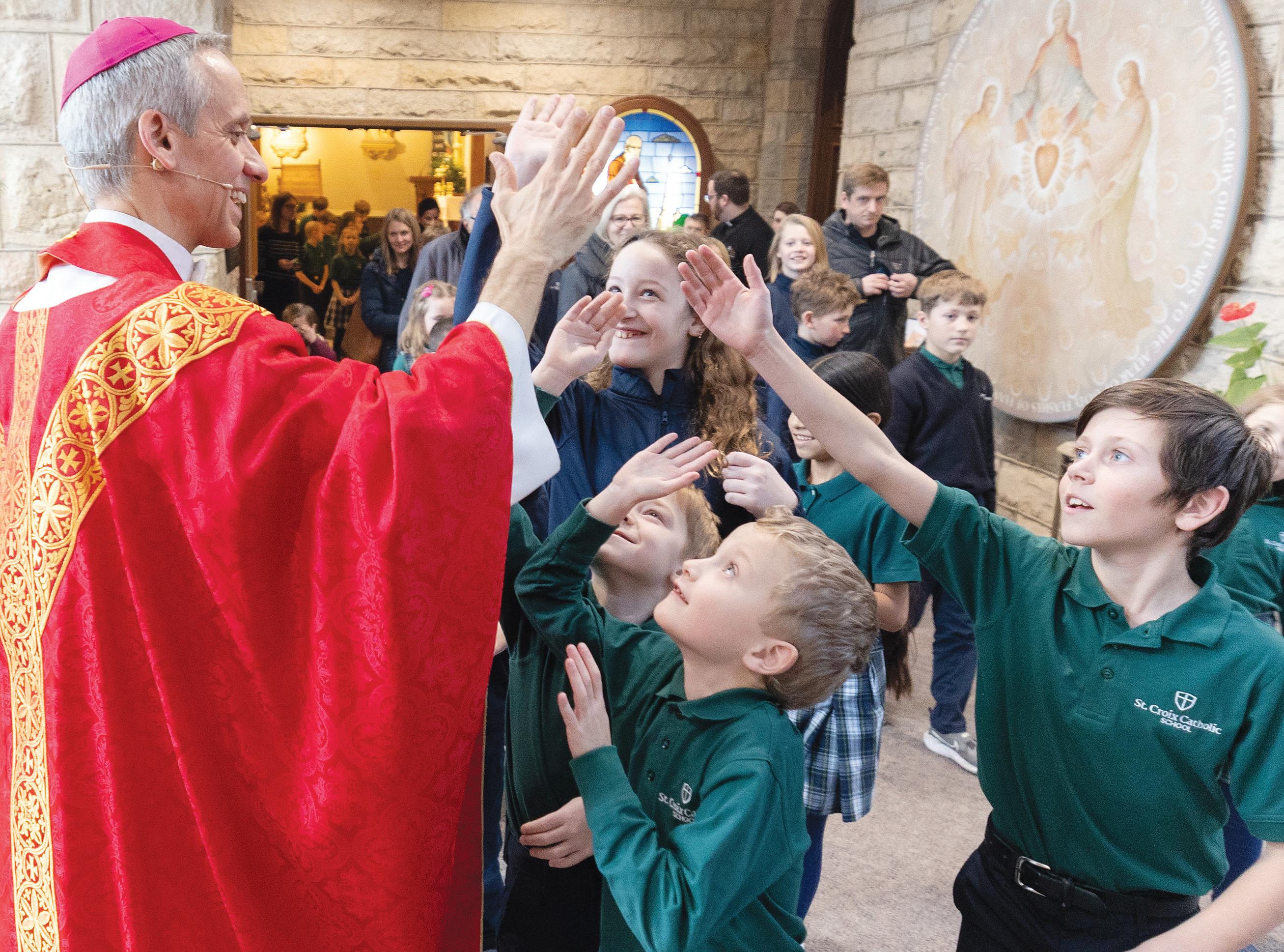 Children in their school uniforms and others nearly filled the church. During the Mass, the bishop-elect engaged children by name, and as the students left Mass, he greeted them, exchanging high fives and smiles.