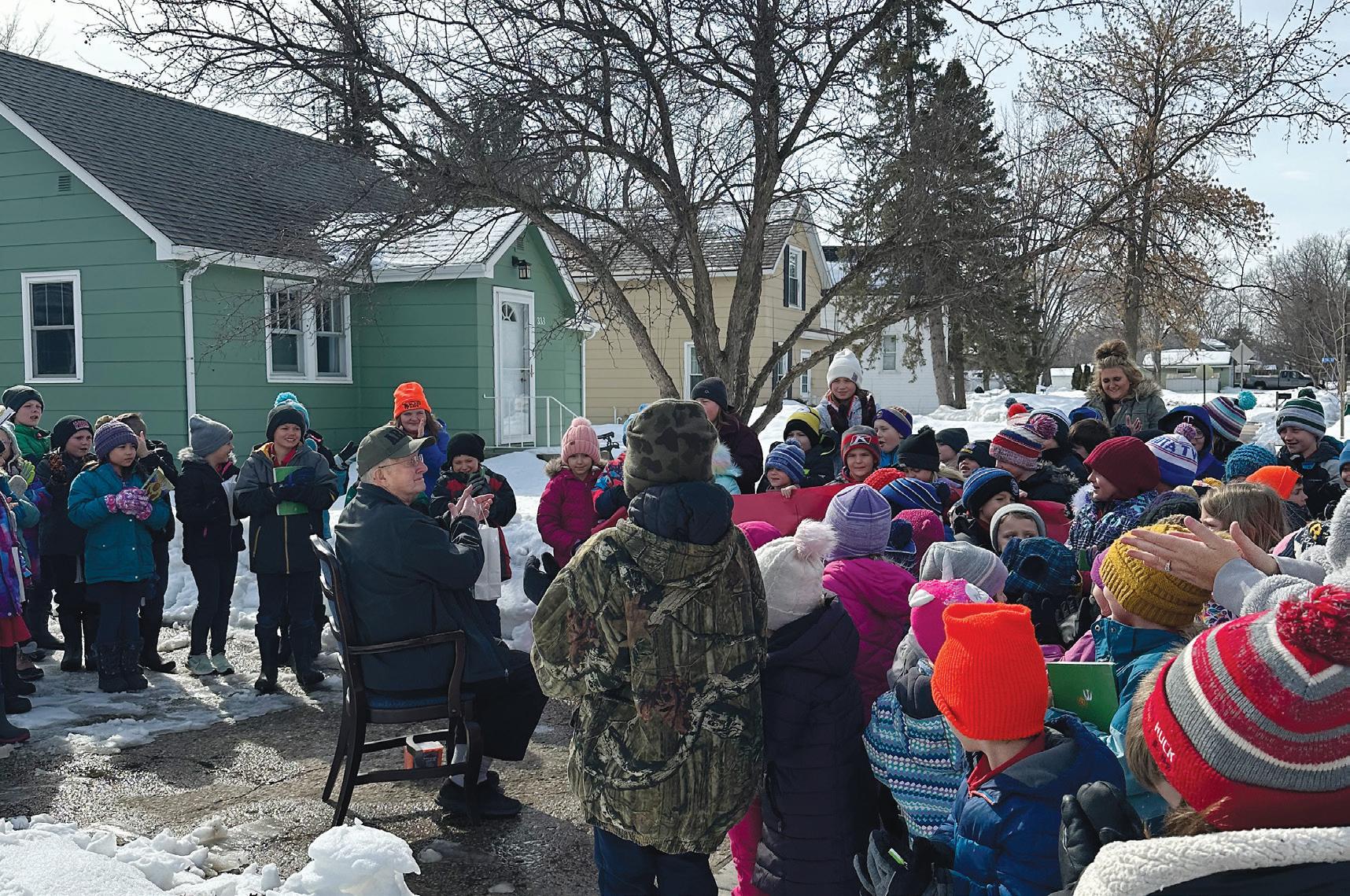 BEING NEIGHBORLY Students in preschool through grade five at St. Anne’s School in Le Sueur brought cards to a neighbor who recently had health problems. “Mr. Peterson” lives between the school and St. Anne’s church, and students pass his house each Tuesday on their way to Mass. Mr. Peterson often goes outside to tell the students, “Good morning” or, if inside, waves from his front window. He made a hopscotch pattern with chalk on the sidewalk for students’ enjoyment and, on Halloween, brought treats to the school for all 140 students. In addition to presenting their cards to Mr. Peterson, the students sang the St. Anne’s Blessing: “May the blessing of the Lord be upon you; we bless you in the name of the Lord.”