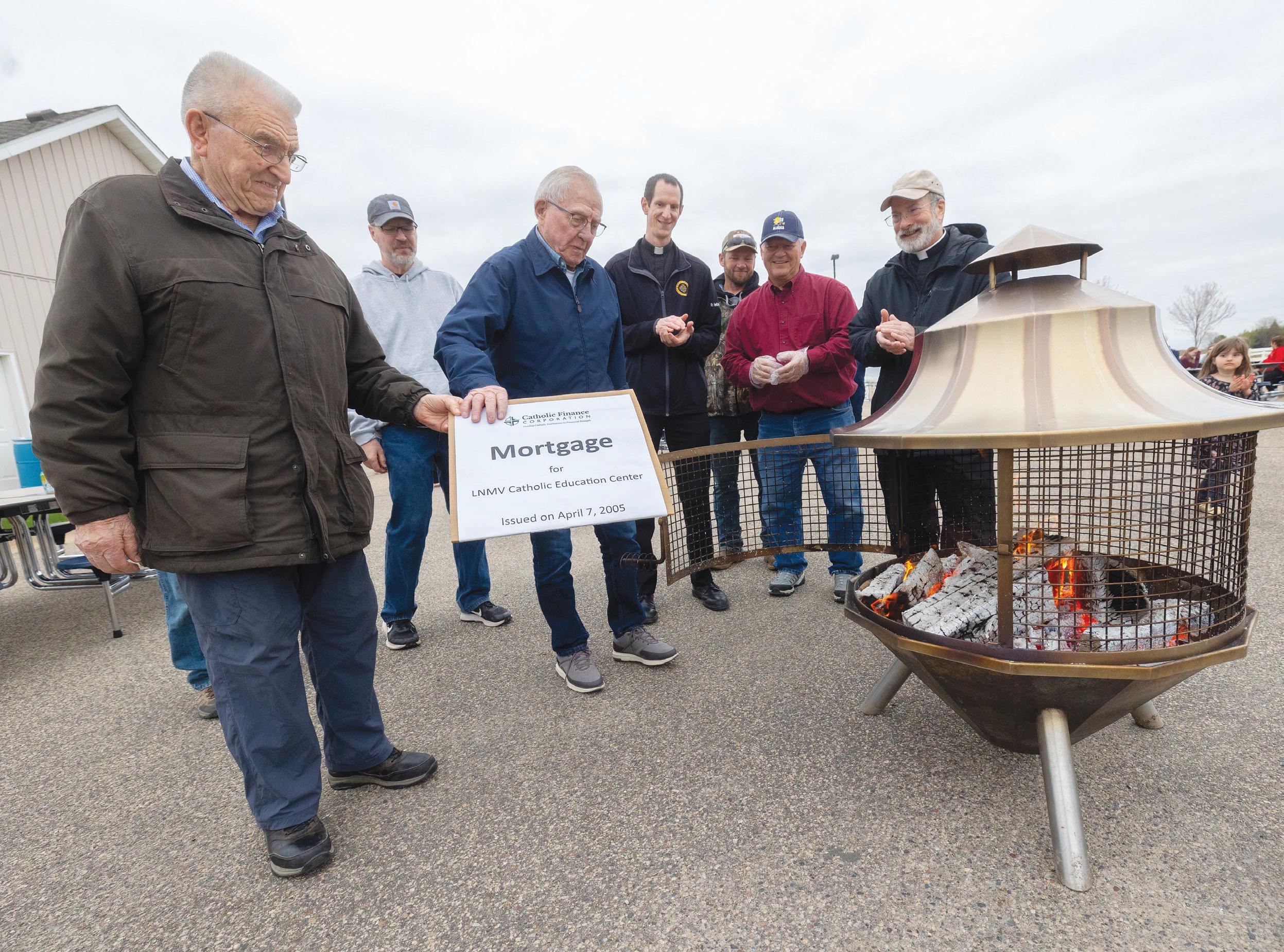 From left, Ben Zweber and Ralph Wagner together place a document representing the paid-off mortgage of Holy Cross Catholic School in Webster in a fire during a special ceremony April 28 at the school. The two men, parishioners of nearby St. Nicholas in Elko New Market, played instrumental roles in the building and financing of the school. Wagner, 90, and his late wife, Geralda, donated the 30 acres on which the school was built in 2005. Zweber, 93, and his wife, Mary, donated 160 acres to the project, which eventually was sold to developers for $3 million. Watching are Father Nick VanDenBroeke, fourth from left, pastor of Immaculate Conception in Lonsdale, and Father Michael Rudolph, far right, pastor of St. Nicholas. These two parishes, plus a third, Most Holy Trinity in Veseli, support the school. The pastor of Most Holy Trinity is Father John Lapensky, who also attended the event. The building, called Lonsdale New Market Veseli Catholic Education Center, is also used for religious education by the three parishes.