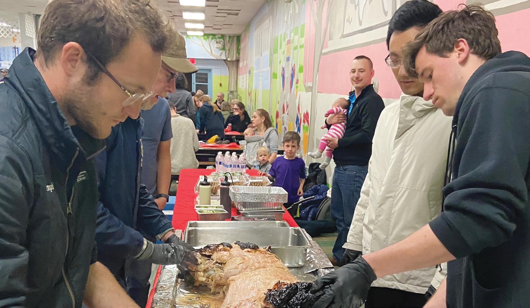 A FEAST TO CELEBRATE ST. MARK Volunteers James Dougherty, left, visiting from Irving, Texas, and David Rabaey, right, a seminarian at St. John Vianney College Seminary in St. Paul, carve a whole hog at St. Mark in St. Paul April 26 to celebrate the April 25 feast day of the church’s patron. St. Mark parishioner James Wilgenbusch, standing behind Dougherty, cooked the hog. Also assisting is Juekun Wen, a St. Mark parishioner, standing behind Rabaey. The hog was donated by Catholic farmer Harry Sloop and his wife, Kellie, who attend St. Francis de Sales in Winthrop, and was shared by about 200 people. Pro Ecclesia Sancta Father David Hottinger led participants in a trivia game about St. Mark. The tie-breaking question asked how many words are in the Gospel of Mark in Greek. The answer: 11,304.