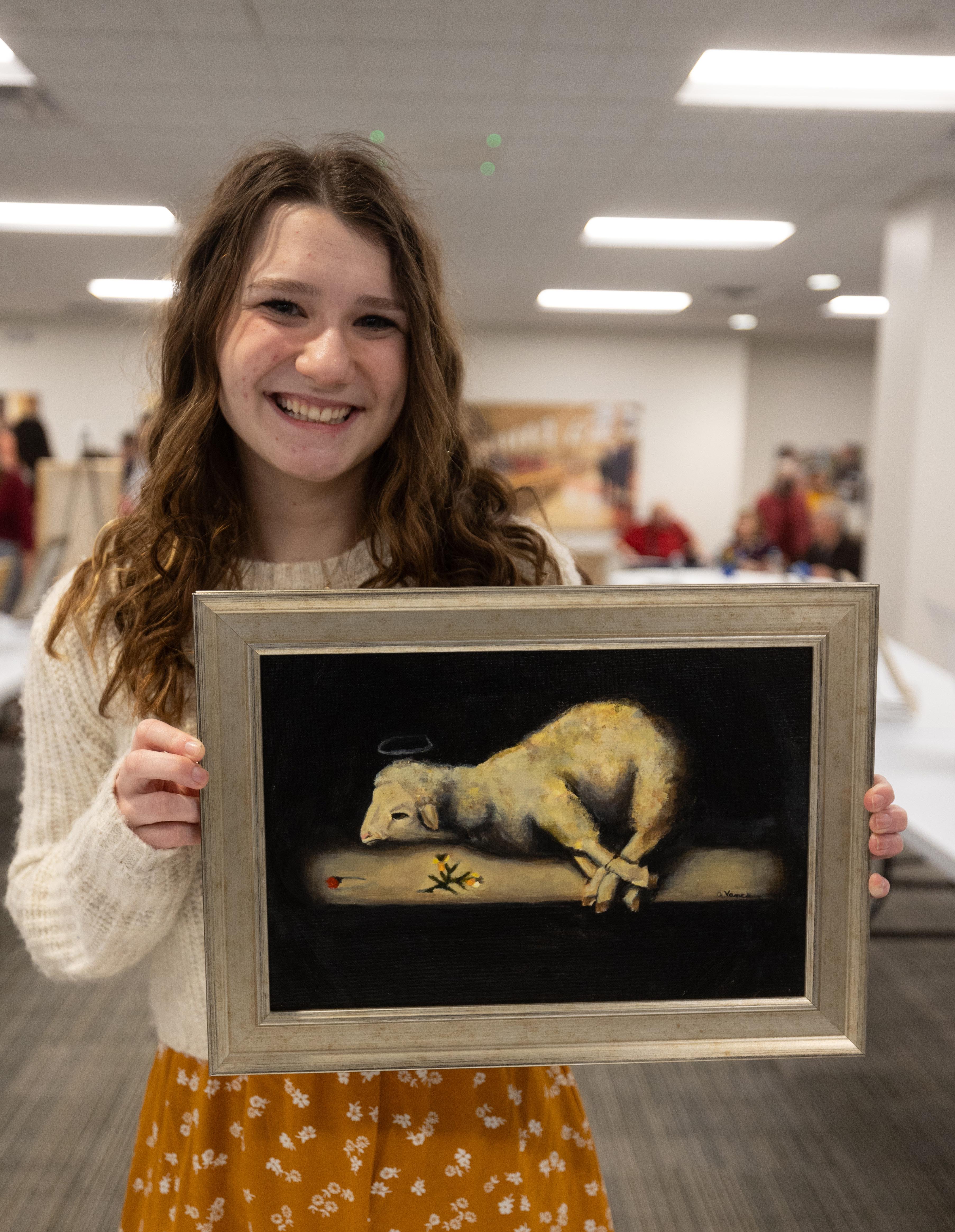 AnnMarie Vance, a junior at St. Agnes School in St. Paul, holds the artwork she created for the Catholic School Visual Arts Exhibition May 3 at the Archdiocesan Catholic Center in St. Paul. Following the theme “The Eucharist,” Vance’s piece, “Lamb of God,” won Best of Show in the contest for seventh through 12th grade Catholic school students. She was one of 27 finalists from 14 Catholic schools in the Archdiocese of St. Paul and Minneapolis. Auxiliary Bishop Michael Izen presented certificates and monetary prizes to seven students for their winning artwork. All the artwork will be displayed at the Archdiocesan Catholic Center. The contest was sponsored by the archdiocesan Office for the Mission of Catholic Education. DAVE HRBACEK | THE CATHOLIC SPIRIT