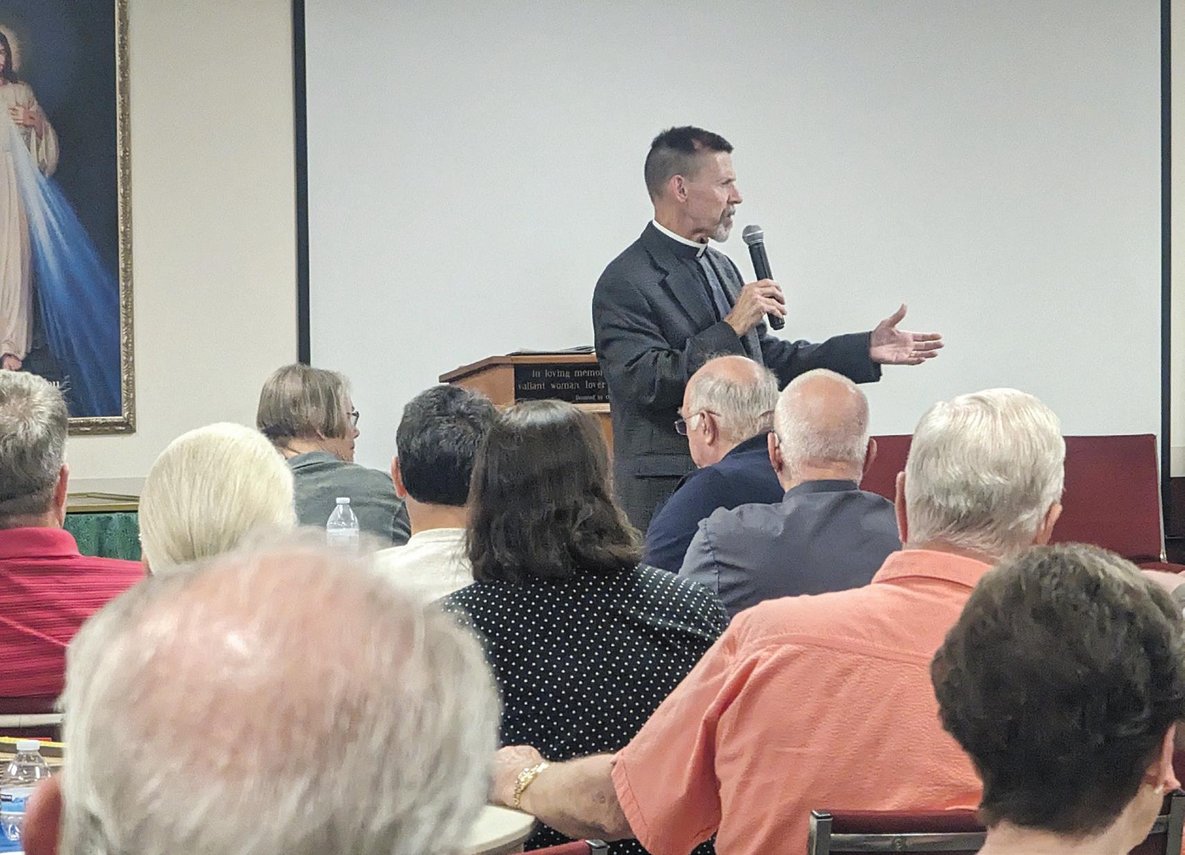 REPORT FROM VENEZUELA Father Greg Schaffer, right, pastor of Jesucristo Resucitado in San Felix, Venezuela, talks with Tom and Rose Winkels of Holy Name of Jesus in Medina at an event Sept. 7 at the University of St. Thomas in St. Paul in which he talked about the history of this mission parish of the Archdiocese of St. Paul and Minneapolis. Father Schaffer was joined by Bishop Carlos Cabezas of the Diocese of Ciudad Guayana, in which the parish resides. There are many hardships and challenges in the parish and the country, Father Schaffer noted, including poverty and various forms of persecution of the Catholic Church by the government. “It’s just a real struggle,” said Father Schaffer, who has served in Venezuela for the last 26 years. Through donations over the years, the parish has provided food, medical and dental care, and other assistance to the people in the parish and the neighborhoods it serves. The archdiocese has served in Venezuela for 52 years. The Sept. 7 event was organized by the Catholic Community Foundation and called Connect with a Cause.