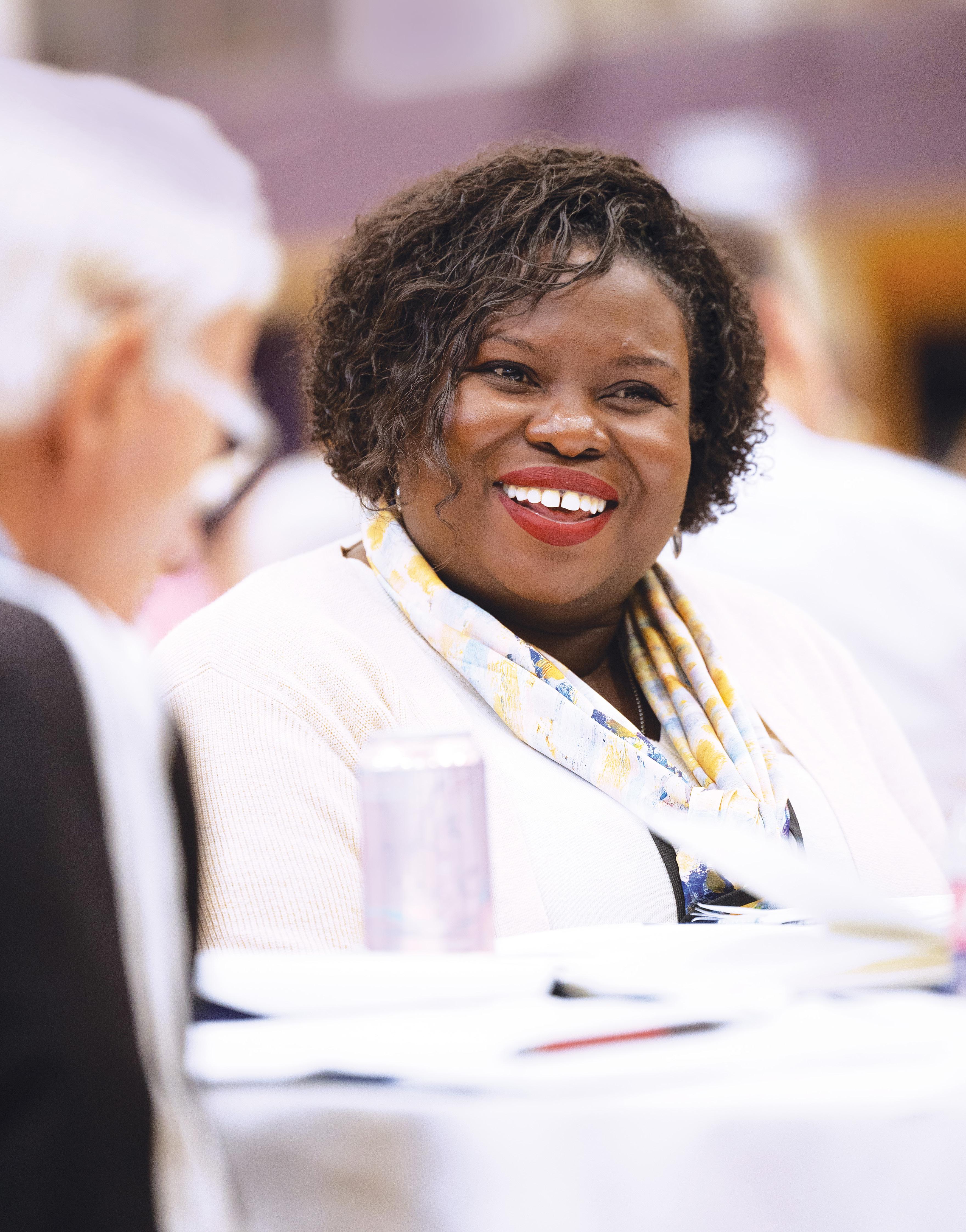 Mahalia Marcelin of Maternity of Mary in St. Paul talks in a small group during the Archdiocesan Synod 2025: Be My Witnesses Assembly June 7 at Cretin-Derham Hall high school in St. Paul. Marcelin was one of more than 400 Synod members from across the Archdiocese of St. Paul and Minneapolis who gathered with Archbishop Bernard Hebda and Bishops Michael Izen and Kevin Kenney to discuss, pray and continue discerning and listening to build unity and evangelization in the archdiocese.