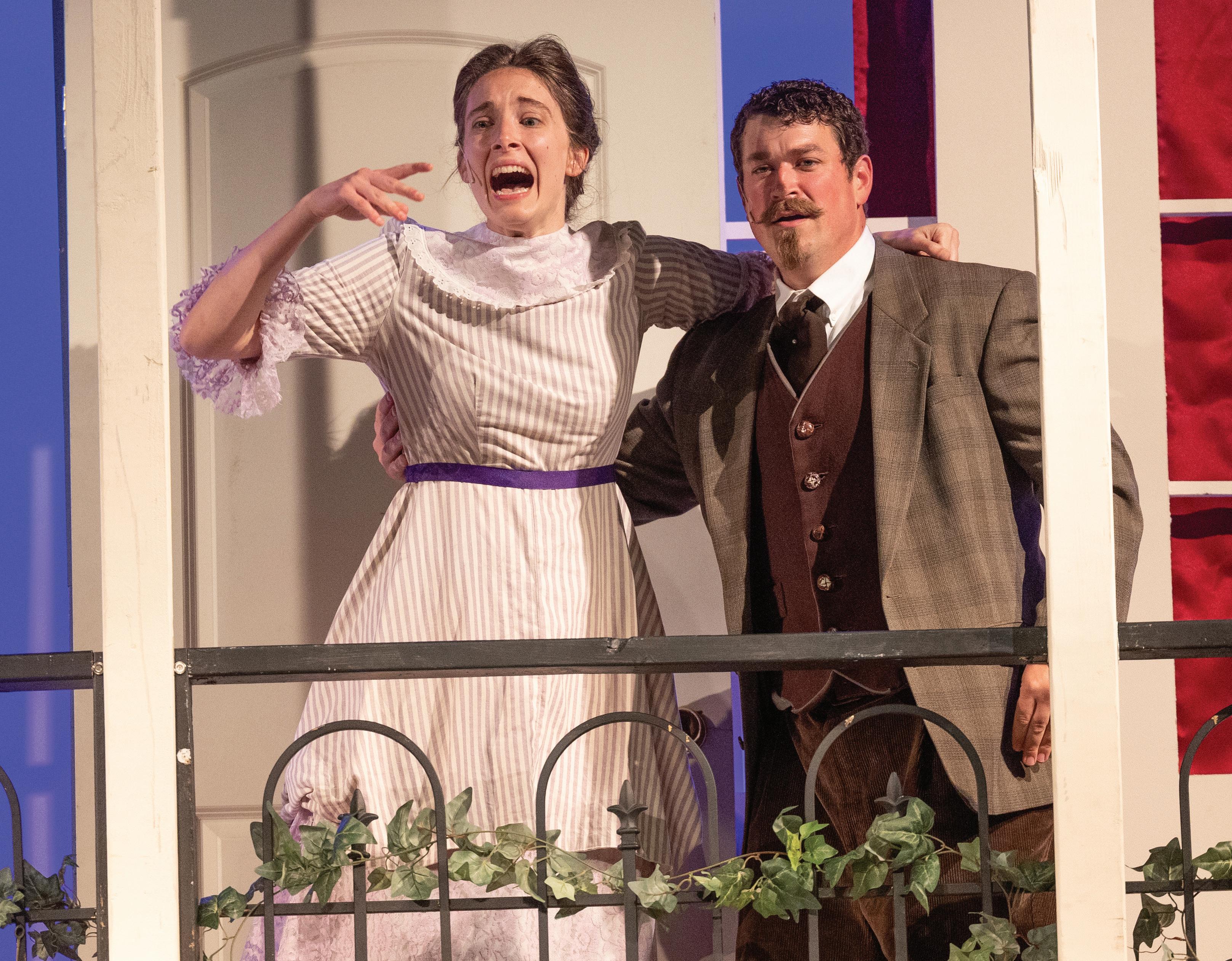 Diana and Chris Smith of St. Joseph in West St. Paul portray Ermengarde and her suitor, Ambrose Kemper, in the play “The Matchmaker” by Thornton Wilder during a dress rehearsal at St. Agnes School in St. Paul June 14. This 1954 play is a production of Missed the Boat Theatre, a nonprofit theater company in St. Paul founded by Father Kyle Kowalczyk, pastor of St. Maximilian Kolbe in Delano, and Mary Shaffer, a parishioner of St. Michael in Stillwater and St. Anne in Somerset, Wis. Performances began June 19 and run through June 28. The Smiths made a spontaneous decision to audition in early March and got the two roles, despite Chris having never been in a full-length play and Diana having been out of theater since her freshman year of college. “I was framing it (the audition) as just a crazy date night,” said Diana, 29. The couple thought there was “no way” they would get cast for the two roles, but after a callback, they landed the two parts. Rehearsals began the day after Easter, April 21. “For me, it’s such a testament of how far my husband will go to show his love for me,” Diana said of Chris, 34. “This is so outside of his comfort zone. He’s a construction worker. He’s not a performer.” For information on upcoming performances and to purchase tickets, visit missedtheboattheatre.com.
