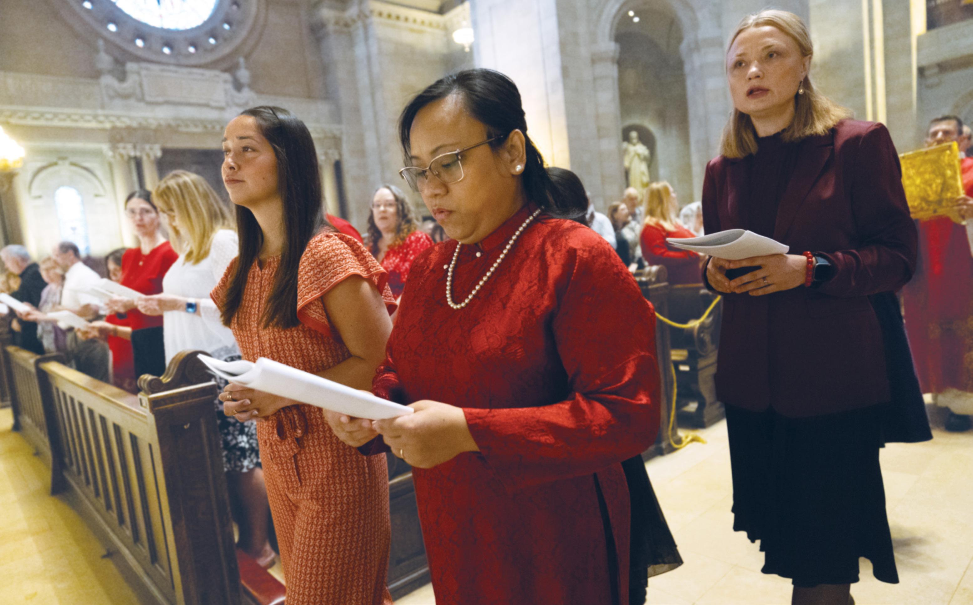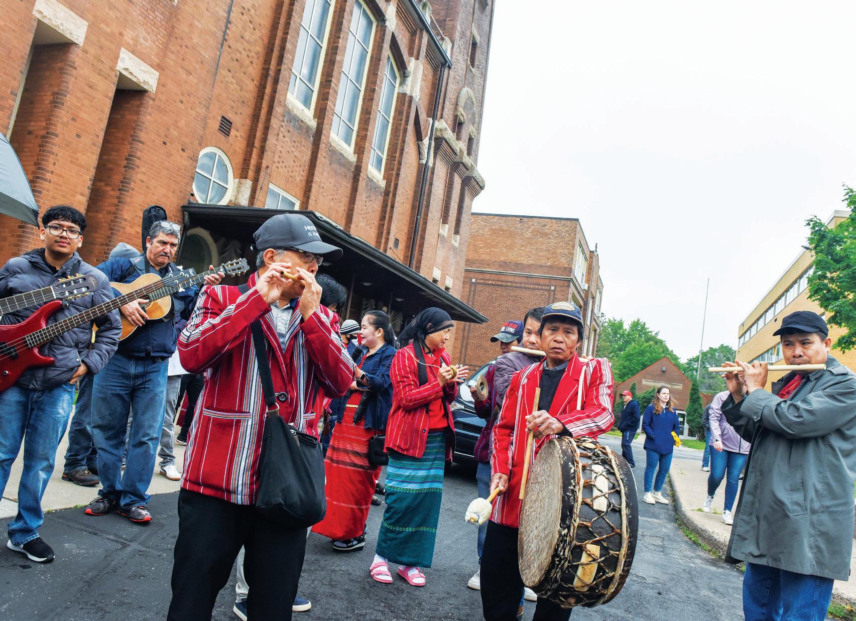 PILGRIMS OF HOPE Karenni choir band members of St. Bernard in St. Paul play drums and flutes and guitarists strum and sing as the musicians help lead a June 14 pilgrimage of hymns and prayers from St. Bernard to the Cathedral of St. Paul in St. Paul. More than 150 people, including children and infants, participated in the 5-mile pilgrimage, despite the rainy morning. The musicians in red were wearing traditional Karenni clothing. St. Bernard is a multicultural parish, and prayers during the pilgrimage were shared alternating English, Spanish and Karenni. The evening before, people prayed before the Blessed Sacrament and went to confession as part of the opportunity to gain a plenary indulgence in this Jubilee Year with its theme Pilgrims of Hope.