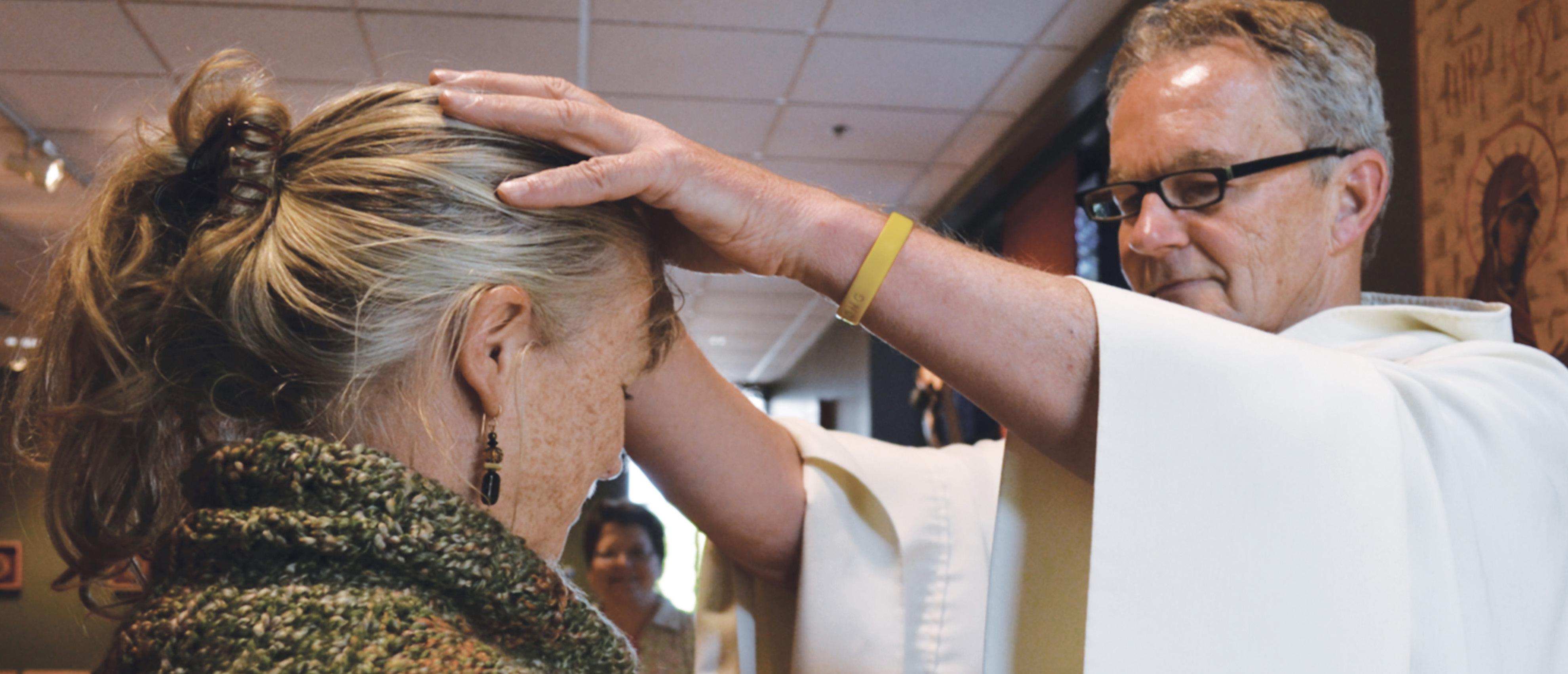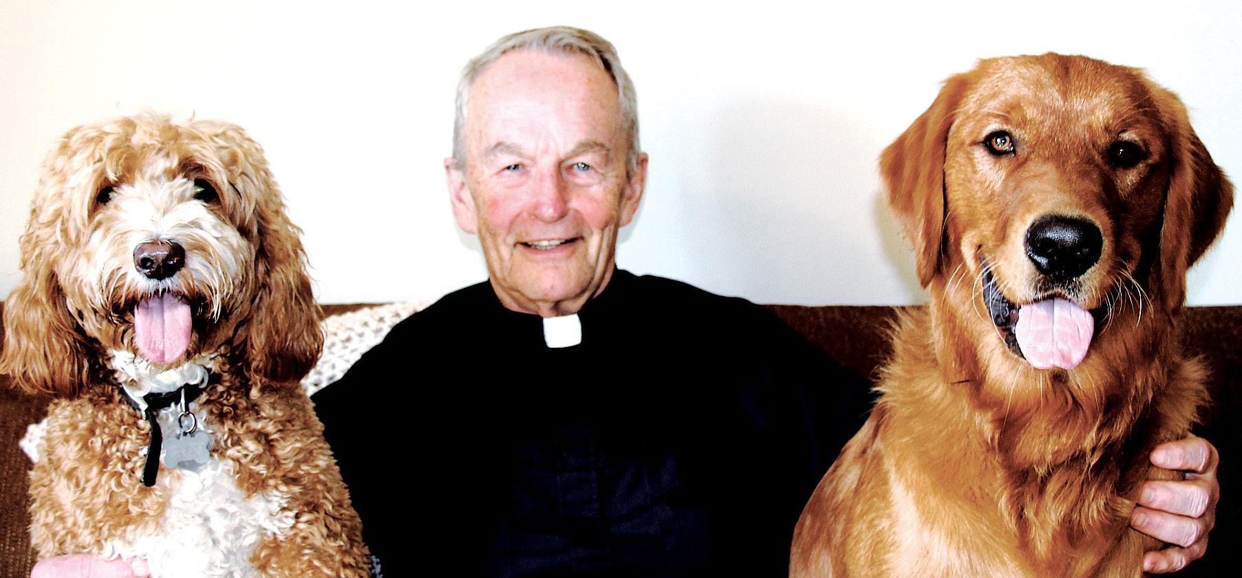 ABOVE Father Bill Murtaugh extends a blessing to a woman at Pax Christi in Eden Prairie. BELOW Father Murtaugh with his two dogs, Murphy, left, and Seamus.