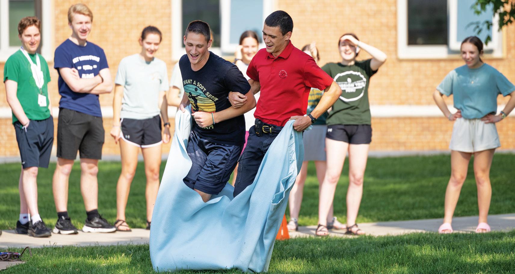 TOTUS TUUS TRAINING Michael Perrault, left, and Greg Maloney, right, second-year seminarians at St. John Vianney College Seminary in St. Paul, participate in a team building exercise at the college June 2 as part of Totus Tuus training week. Their task was to get their group of 13 across a field on a blanket without touching the grass. The activities were facilitated by Jerome Meeds of Dunrovin Retreat Center north of Stillwater. The missionaries will minister as evangelists and catechists for young people in weeklong summer camps in parishes across the Archdiocese of St. Paul and Minneapolis. Behind them are other college and seminarian students who will also go out to parishes. Totus Tuus began in the archdiocese in 2013 under Nancy Schulte Palacheck’s leadership in what is now the Office of Discipleship and Evangelization. Last year, the Winona-Rochester and St. Cloud dioceses joined the archdiocese’s more than eight days of training. This year, a representative from the Diocese of Crookston is attending as well. The archdiocese is training 52 missionaries seminarians and other college-age men and women to serve in Minnesota dioceses. Fun fact: three newly ordained priests for the archdiocese Fathers Benjamin Eichten, Zachary Oschenbauer and Randall Skeate are alumni of the Totus Tuus program. More information about Totus Tuus and where the missionaries will minister this summer can be found at archspm.org/totus-tuus
