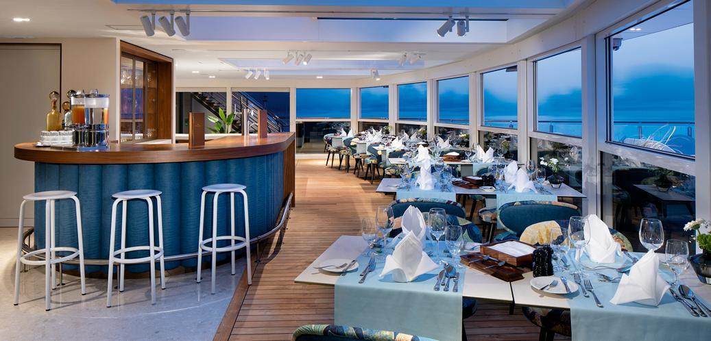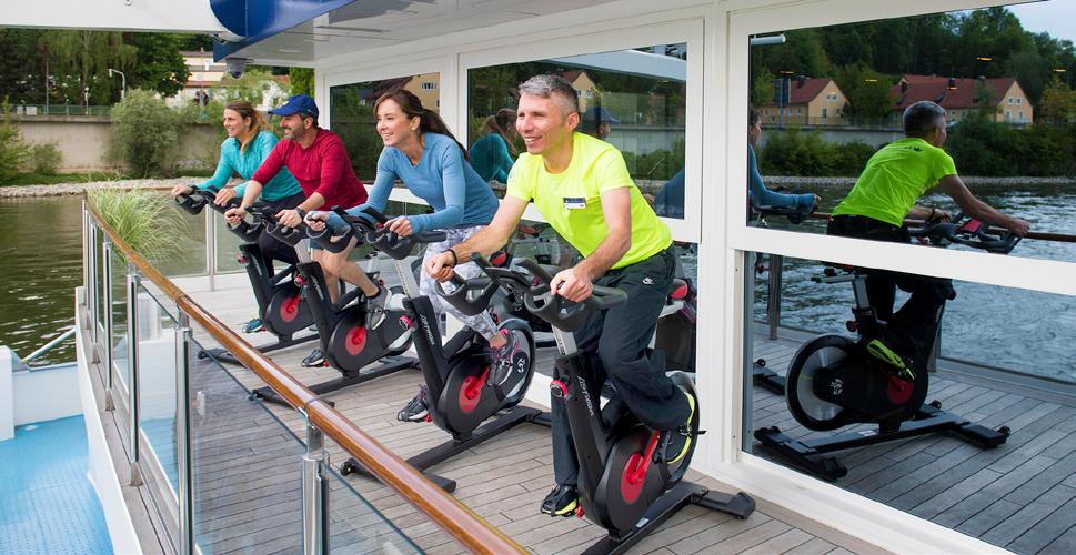 An expansive space with a fitness centre offering invigorating classes led by a professional Wellness Host, as well as outdoor spin bikes, two massage rooms, a refreshing juice bar and manicure/ pedicure services. There is also an onboard hair salon.