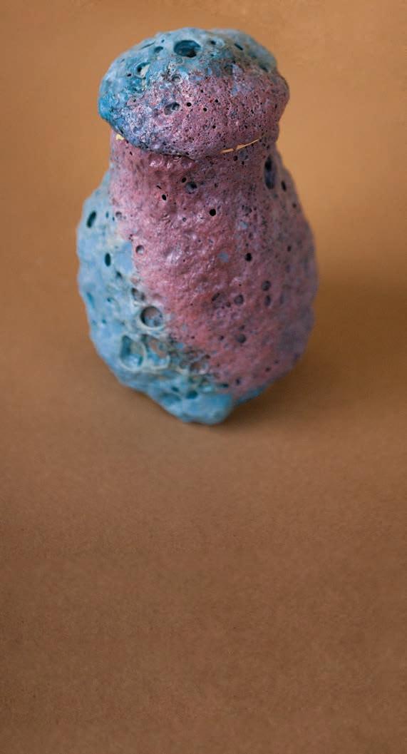 grown stronger, and her own unique style has developed. She works largely with cylinders, ranging in sizes, and likes to test how they interact with each other. In terms of inspiration, she is drawn to exposed piping behind restaurants, or water towers left to rust. “I draw from the mundane — dirty stuff that everybody uses and it serves its function, but nobody really looks at,” Sparks says. “Nobody is going up to these things and saying, ‘Oh, let’s take a photo of this.’ I look at things that serve a purpose but don’t necessarily stand out, mostly pipes, and that’s where the cylinders come from.” She also likes to experiment with glazes on her pieces and describes her artistic process as essentially a series of experiments with configurations of cylinders, combinations of glazes and various firing techniques.