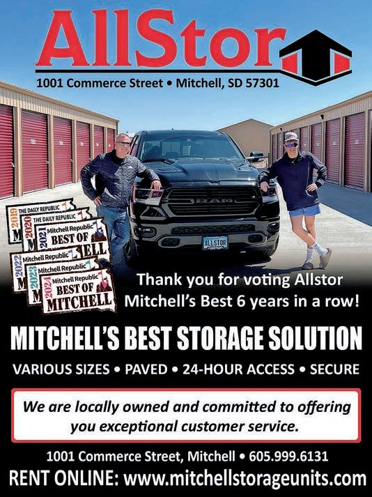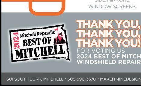 2024 BEST OF MITCHELL | 9 605-996-2262 122 S Main • Mitchell SD 57301 Thank You for Voting us Best of Mitchell for Manicure-Pedicure THA N K YOU FOR VOTING US Best Car Maintenance & Repair for 11th year in a row! 605-996-1042 1510 S. Burr St. • Mitchell MITC H E LL!