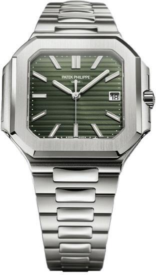 PPatek Philippe has launched an innovative collection that encapsulates the essence of “elegant sporty” style, showcasing a unique fusion of boldness and sophistication. The new Cubitus collection introduces a square-shaped case with gracefully rounded corners and a distinctive dial featuring horizontal relief embossing. This collection debuts in three striking variations, each exuding its own character: the technically advanced Cubitus Instantaneous Grand Date, Day and Moon Phases, Reference 5822P-001 in platinum; the vintage-inspired two-tone Cubitus Reference 5821/1AR-001 in steel and rose gold with a blue sunburst dial; and the refined Cubitus Reference 5821/1A-001 in steel, embodying the essence of sporty elegance with an olivegreen sunburst dial.