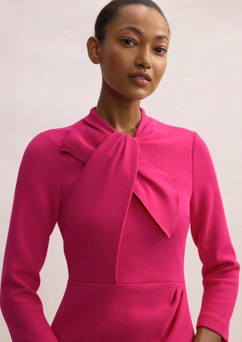 REMINGTON DRESS Pink multicolour geometric print crepe de chine. TIERNEY BLOUSE Pink multicolour geometric print crinkled georgette. ADELAIDE TROUSERS Fuchsia pink sculpt stretch crepe. SAVONA 80 HEEL Blush pink patent leather. FLORINA BLOUSE Rose pink stretch silk. ALZIRA TROUSERS Navy 365 pure Italian wool.