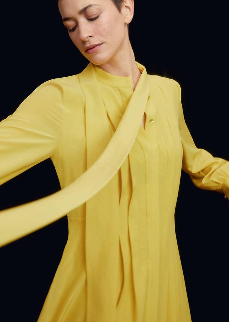 This page: AMBERLEY DRESS. Cornflower blue stretch crepe. Facing page: LAVIANO DRESS Chartreuse stretch crepe. Also available in cerulean blue. TREVISO 80 HEEL Chartreuse suede. Also available in fuchsia pink.