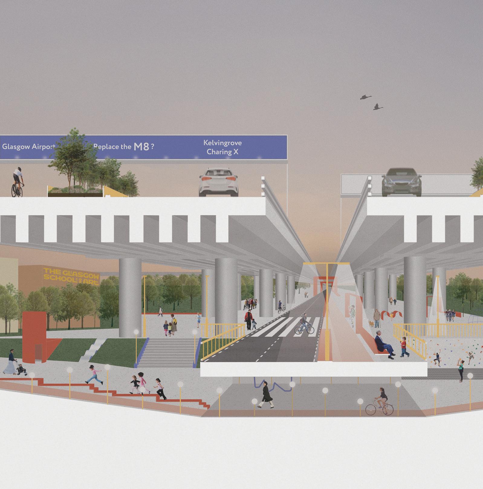 The project is an exploration into the forgotten spaces of Glasgow. It to aims test the bounds of Glasgow’s approach to feminist urban planning through challenging the stigma surrounding the M8. Many cities across the world have moved their arterial roads to the outskirts. Instead, this project looks through an intersectional feminist lens. It proposes the potential in retaining the motorway, challenging its image and transforming it into a new public realm, designed for connection, community and play.