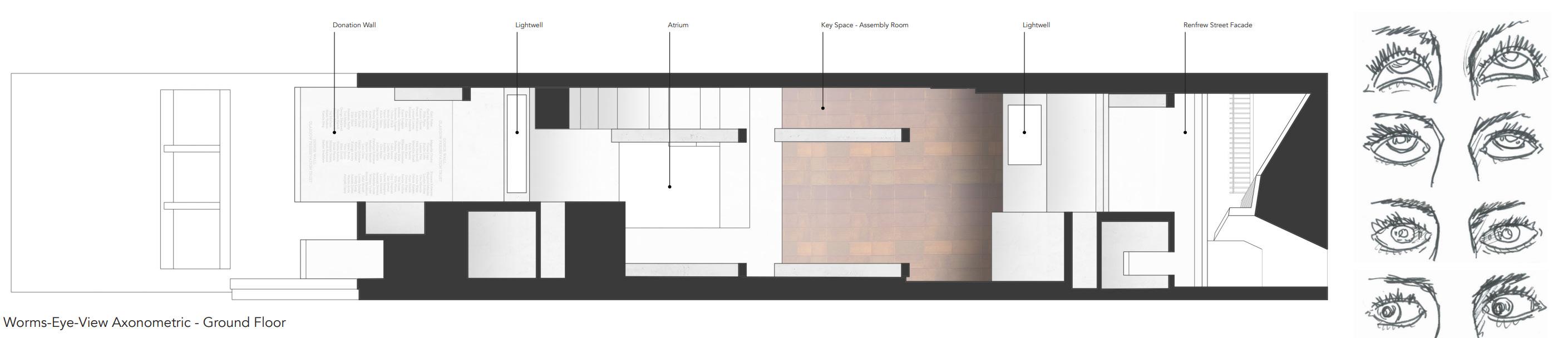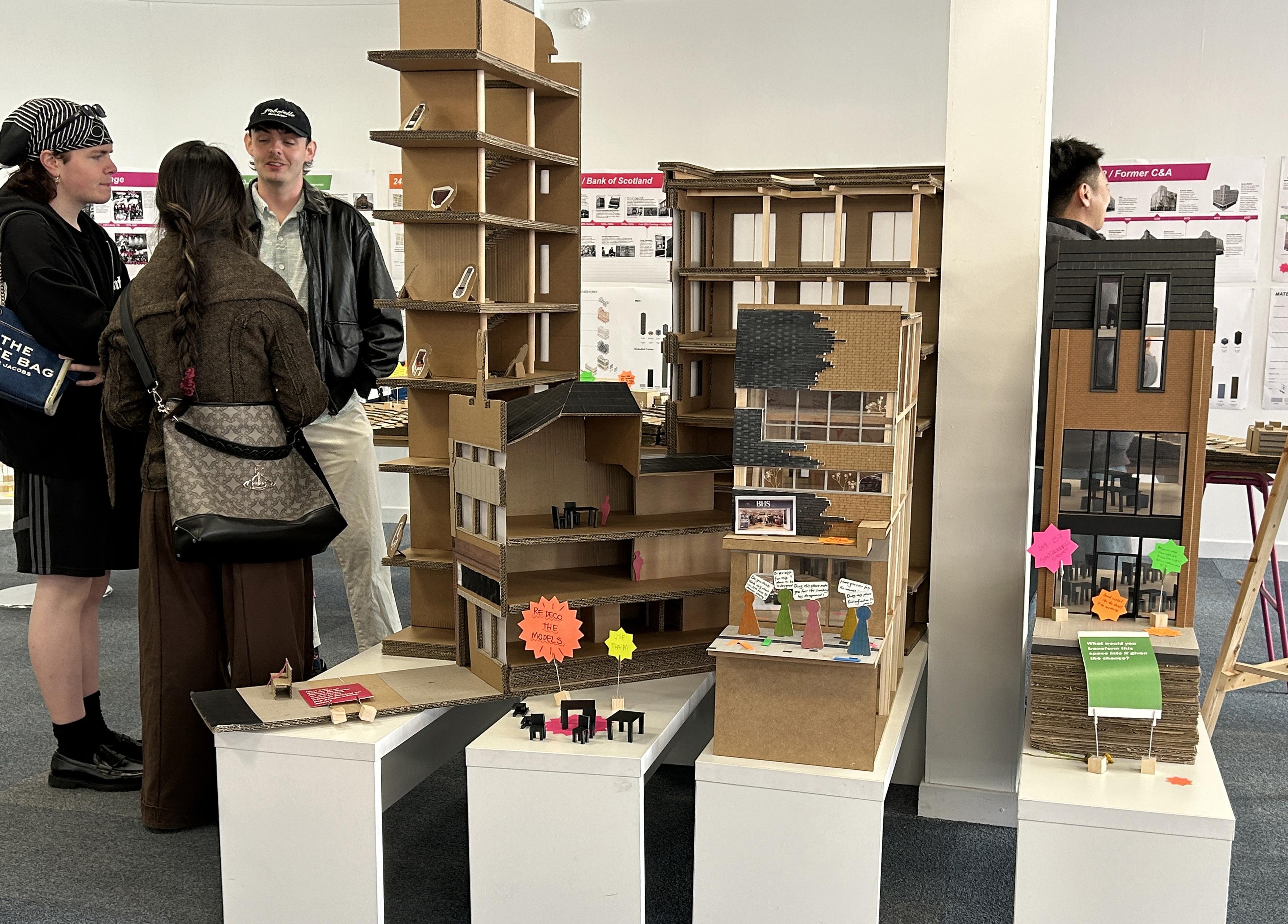 The final phase culminated in a public exhibition at Edward House. Students set up the exhibition, hosted discussions, and recorded contributions, which will be shared with Glasgow Life as part of the Culture and Heritage District development. Using a shared 1:200 scale model plus 1:20 sectional models, drawings, and visual narratives, they invited reflection on the buildings’ past and possible futures.