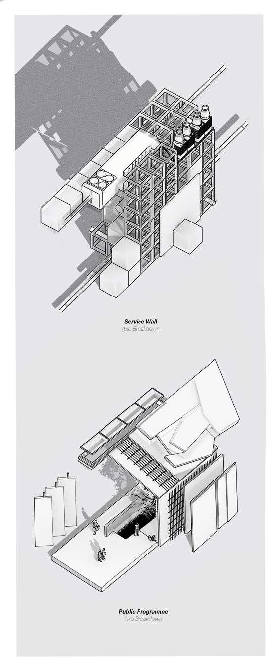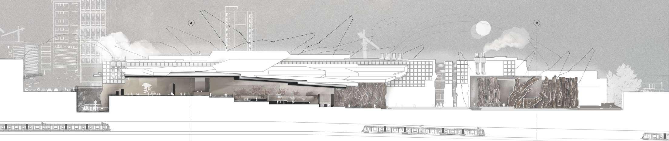 The project is underpinned by a sustainability approach towards our urban environment that acknowledges existing infrastructure, not for its architectural or historical merit, but its functionality, the fact that it is existing, and the potential that lies within it. Our existing motorway infrastructure could become an umbrella that shields playing children from the rain; in a future less car-centric society it could become a route for cyclists or a spine of woodland that allows nature to course through our city centre.