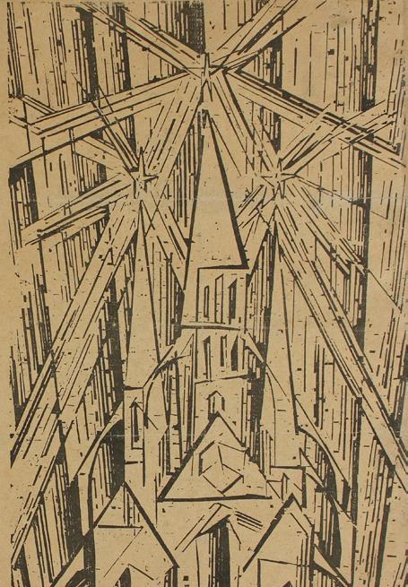 Though perhaps not a direct inspirational source for Clarke’s spire design, the woodblock print Kathedrale (Cathedral, 1919) by the German Expressionist artist Lyonel Feininger (1871–1956) serves as an intriguing comparison. Feininger’s rendering of the church—with its dynamic rays of light emanating from the stars above the spire—symbolically connects the heavenly with the earthly, the supernatural with the manmade. Feininger was a teacher at the Bauhaus (1919-33), and his print served as the cover illustration to Walter Gropius’ manifesto for the founding of the Bauhaus (1919). Gropius chose Feininger’s Expressionist image as it reflects both the aura of medievalism and his pedagogical programme for the Bauhaus—new work springing from the type of training employed by Late Gothic craft guilds. Whether Clarke was aware of Feininger’s