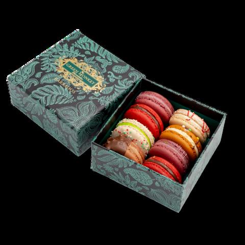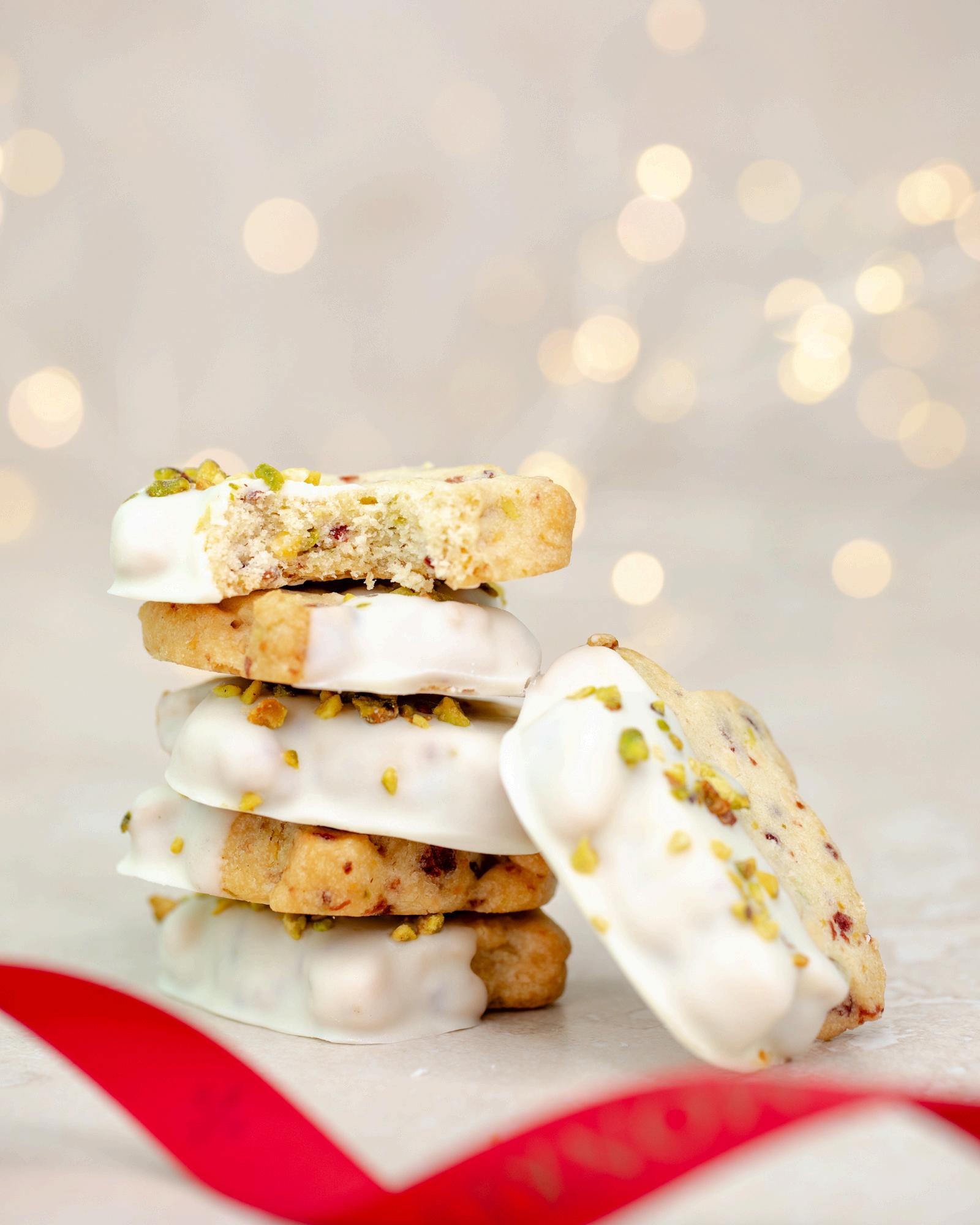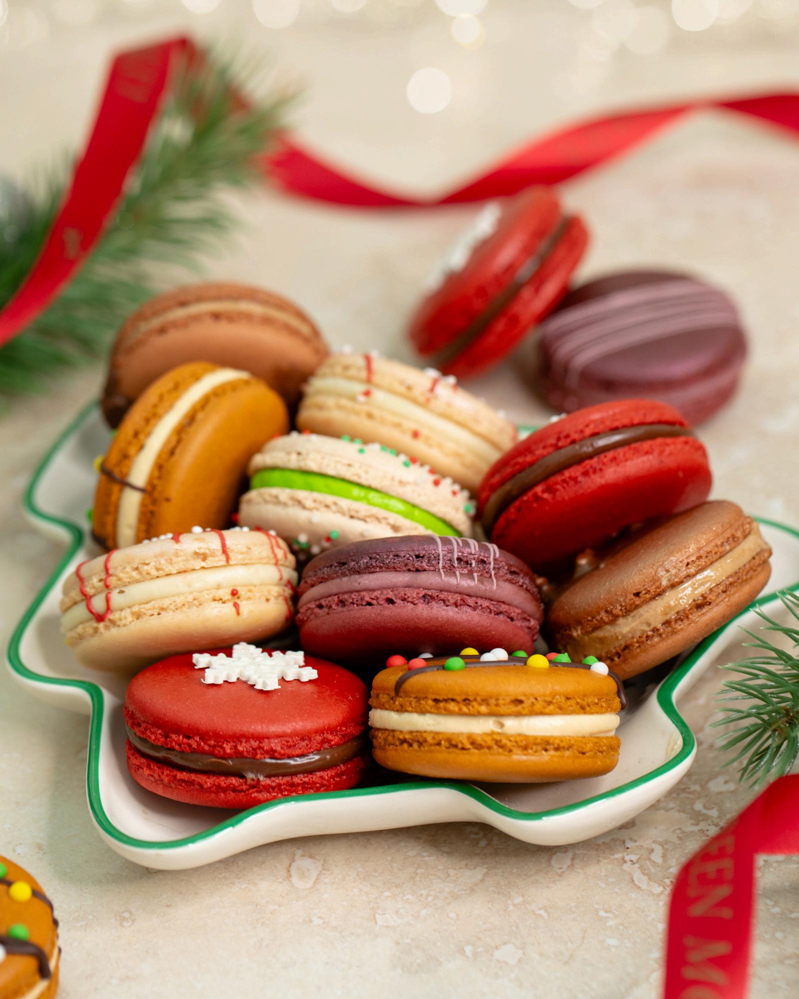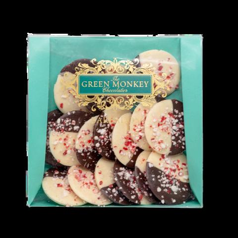 Our festive mendiant collection, featuring swirls of peppermintinfused white and dark chocolate. Each piece is elegantly topped with crunchy candy cane bits, adding the perfect holiday crunch to this timeless treat.