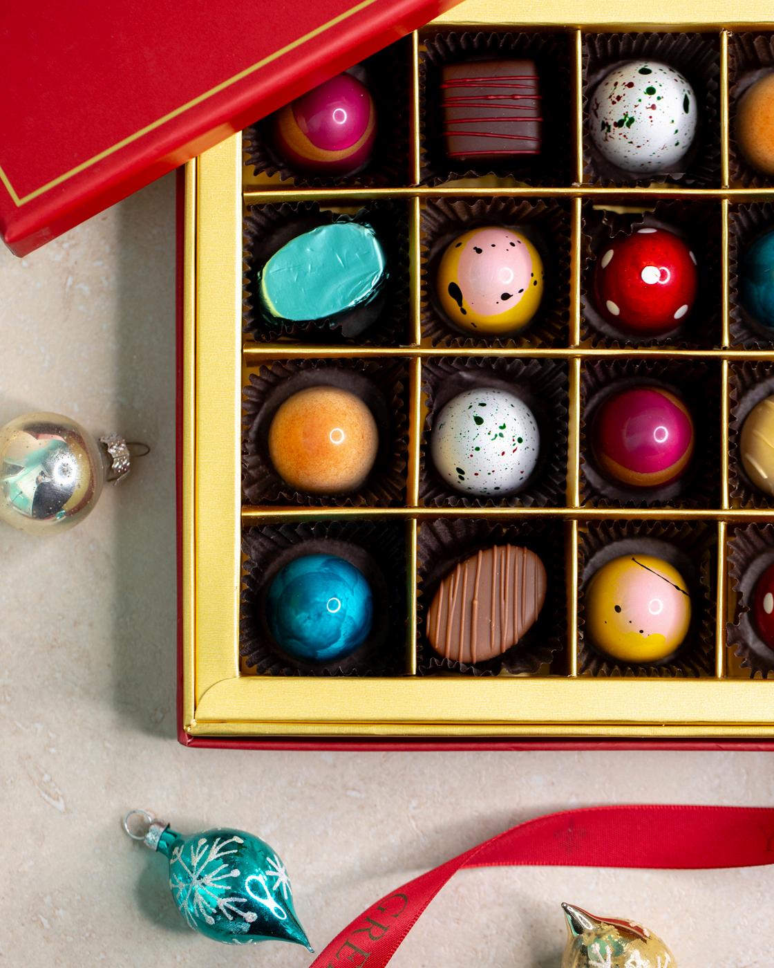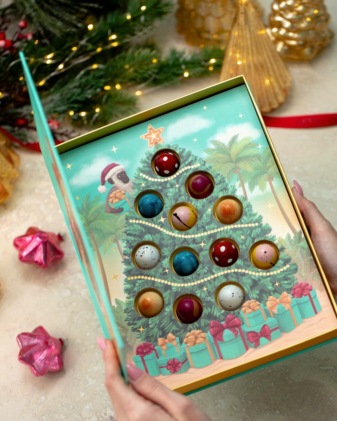Agiftthatfeelslikeopeningaholidaystory.Liftthecov our musicstorybookandthescenecomestolife-aChris treeadornedwith12jewel-likechocolatetruffles,eachglea likeanornament.Insideawait2ofeachofourlimited-ed festiveflavours,craftedexclusivelyfortheseason.