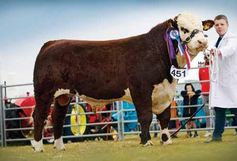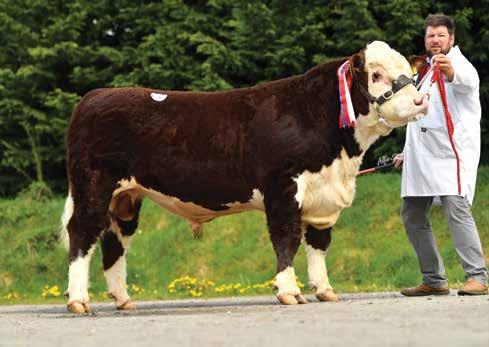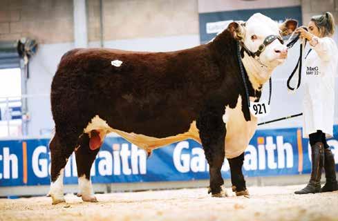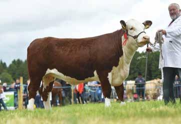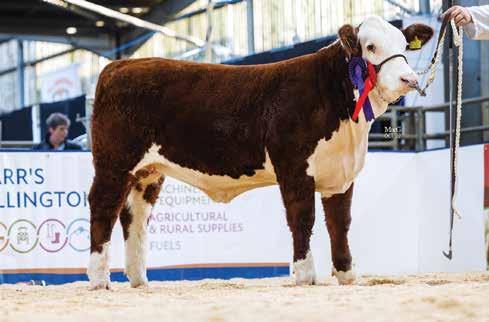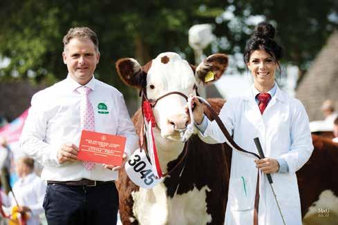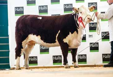 September 2020-born Pulham Pansy 26th from first time exhibitors James and Ellen Lake, Froxfield, Hampshire, a firsttime exhibitor at the National Hereford Show, where it stood reserve supreme and grand female champion. Hereford Cattle Society members since 2019, Pansy was purchased from Philip and Laura Vincent from their Norfolk-based herd as a calf atfoot to its mother Clipston Pansy T3.