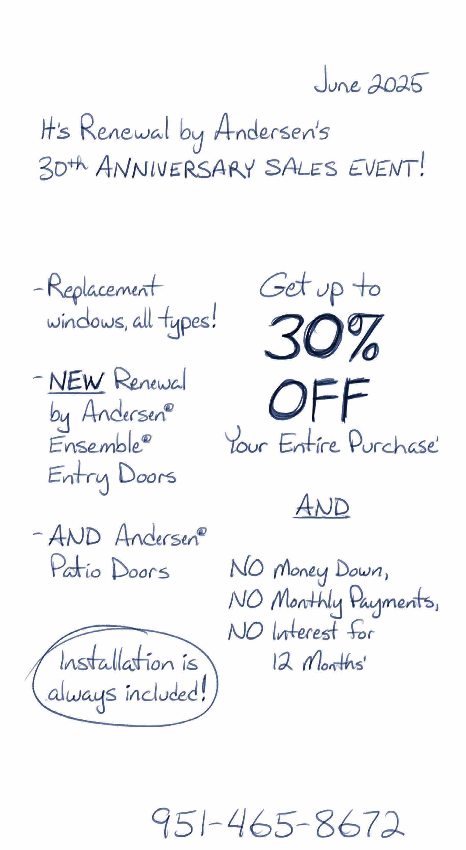1DETAILS OF OFFER: Offer expires 7/5/2025. Not valid with other offers or prior purchases. Get 25% off your entire purchase, plus an additional 5% off your entire purchase, and 12 months no money down, no monthly payments, no interest when you purchase four (4) or more windows or entry/patio doors between 6/11/2025 and 7/5/2025. Additional 5% off your entire purchase valid only on initial design consultation visit. 12-month Promo Period when no payments are due, interest accrues but is waived if the loan is paid in full before the Promo Period expires. Any unpaid balance owed after the Promo Period, plus accrued interest, will be paid in installments based on the terms disclosed in the customer’s loan agreement. All loans are unsecured personal loans subject to credit review and approval. Financing for the rFinance® consumer loan program is provided by various financial institutions without regard to age, race, color, religion, national origin, gender, or familial status. Savings comparison based on purchase of a single unit at list price. Available at participating locations and offer applies throughout the service area. License numbers available at renewalbyandersen.com/license. Some Renewal by Andersen locations are independently owned and operated. ‡Review aggregator survey of 5-star reviews earned from 2015-2024. Reputation.com, March 2025. “Renewal by Andersen” and all other marks where denoted are trademarks of Andersen Corporation. © 2025 Andersen Corporation. All rights reserved. This was delivered via the United States Postal Service®. RBA14227 THANK YOU FOR YOUR BUSINESS.