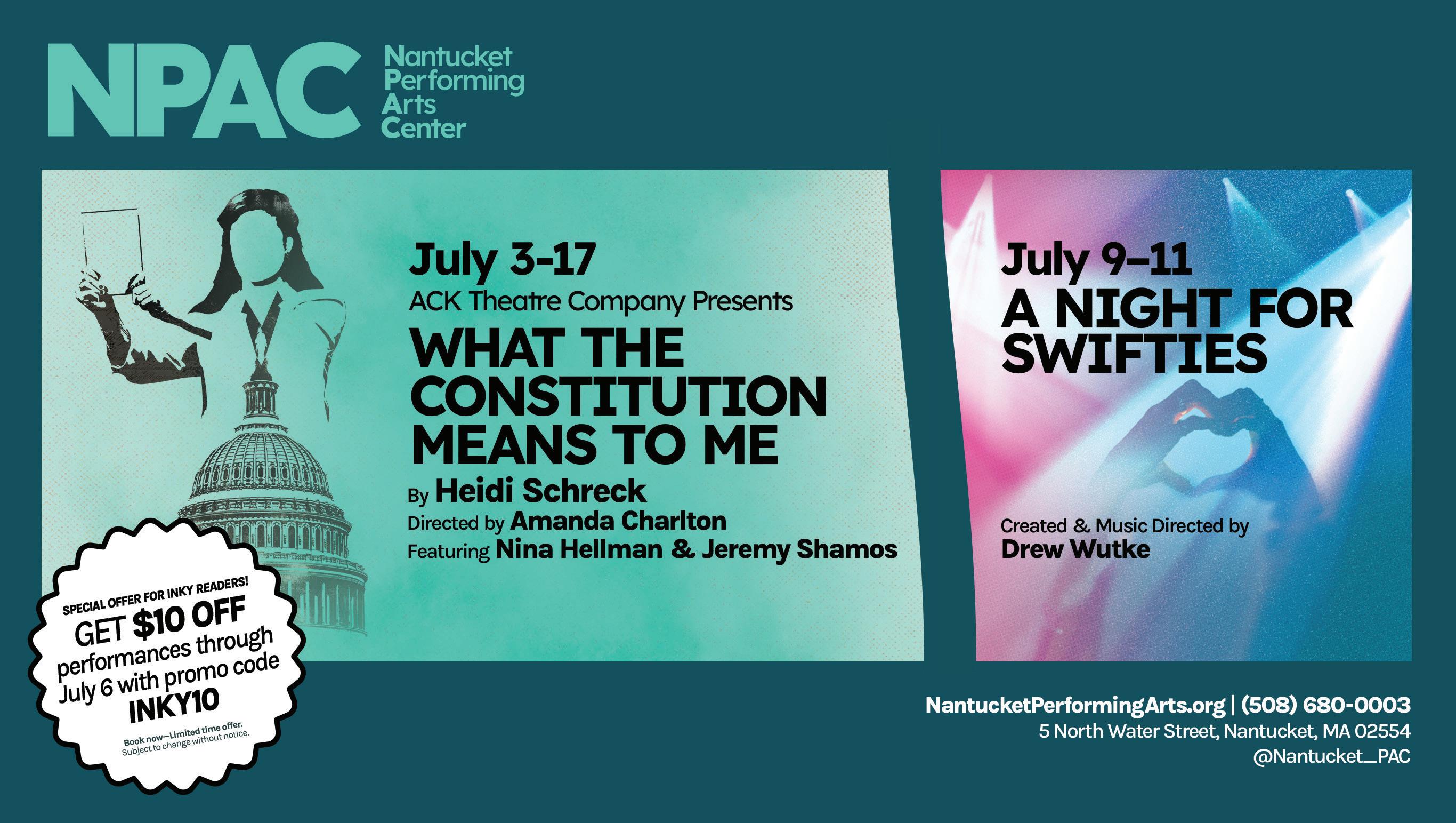 “What the Constitution Means to Me” 7:30 p.m. Nantucket Performing Arts Center, 5 North Water St. The ACK Theatre Company kicks off its inaugural season with Heidi Schreck’s “What the Constitution Means to Me,” starring Nina Hellman and Jeremy Shamos. Through July 17. Tickets at nantucketperformingarts.org