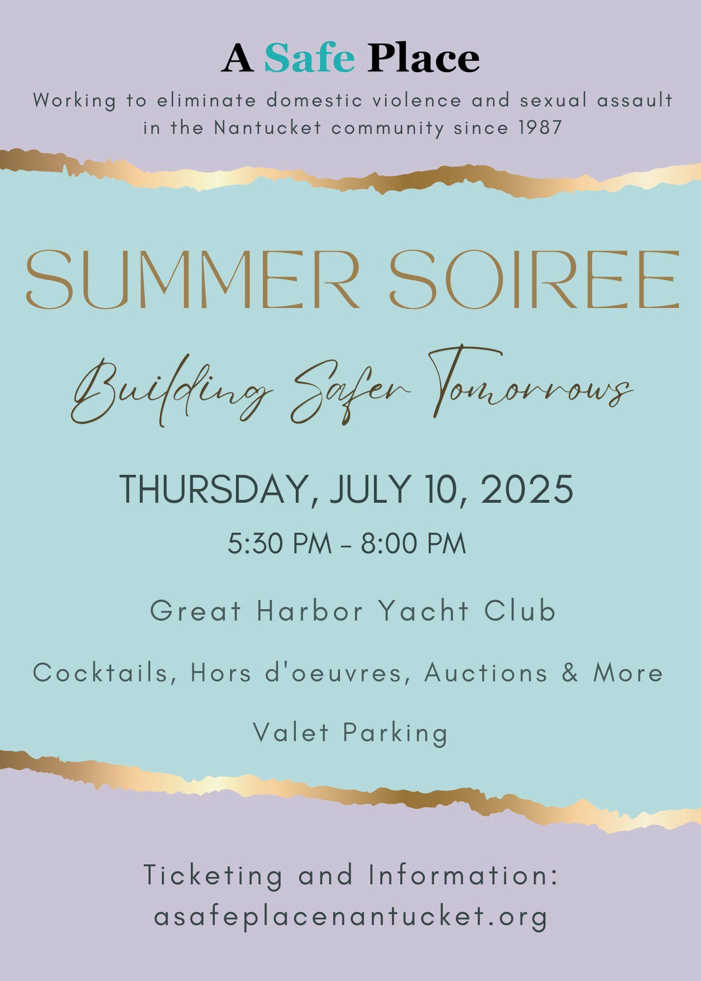 5 p.m. Nantucket Shipwreck & Lifesaving Museum, 158 Polpis Road. A curated wellness-themed silent auction; seasonal hors d’oeuvres from Island Kitchen; live music by Billy Voss; remarks from the Nantucket police and fire departments and Nantucket Cottage Hospital; a mission moment from Kaeyllane DeLima Dias on our island’s youth; and more. Benefits Fairwinds, Nantucket’s Behavioral Health Center. Tickets at fairwindscenter.org
