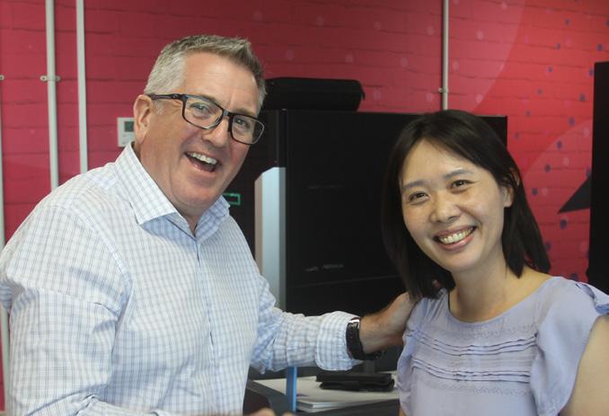 10-11 PrintNZ Helping Hand: Iain MacIntyre meets Tainui Press Apprentice of the Year winners: Jackie O’Reilly and Vanessa Hooton.