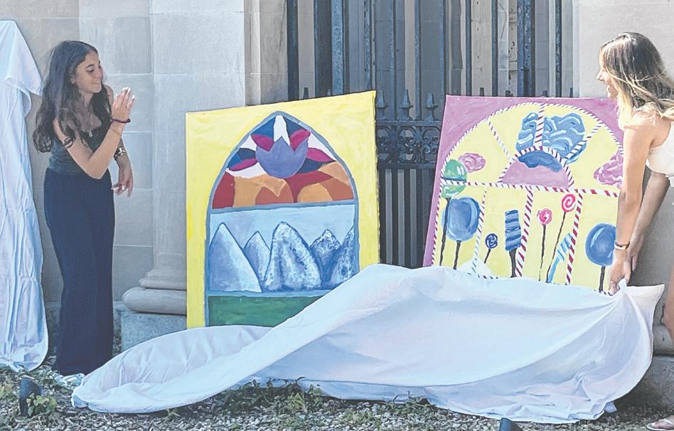 The Roslyn Landmark Society unveiled four student paintings resembling stained glass windows to act as window coverings for the Mackay Estate Gate Lodge during restoration projects and presented a Roslyn High School student with a $1,000 scholarship during a ceremony Thursday.